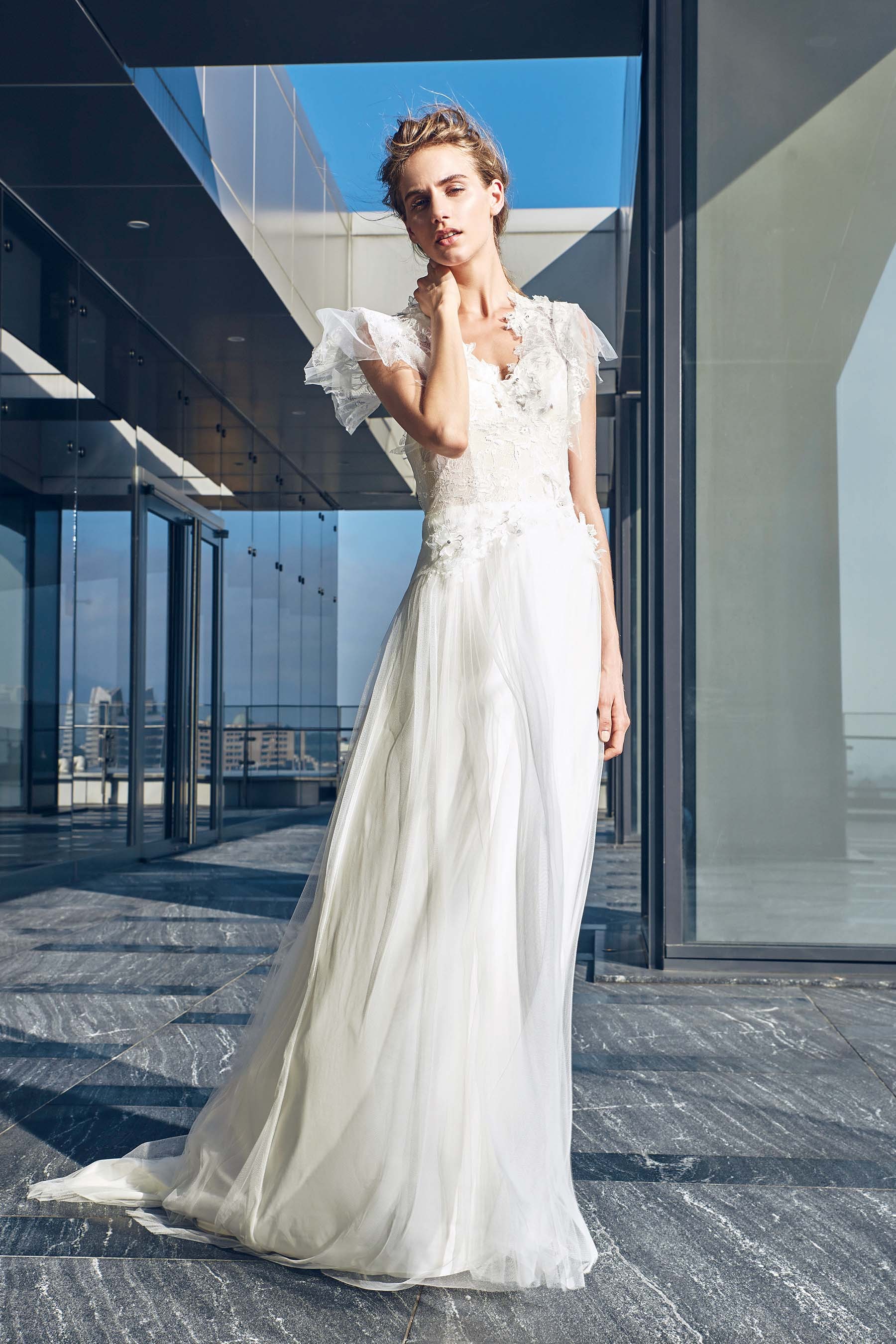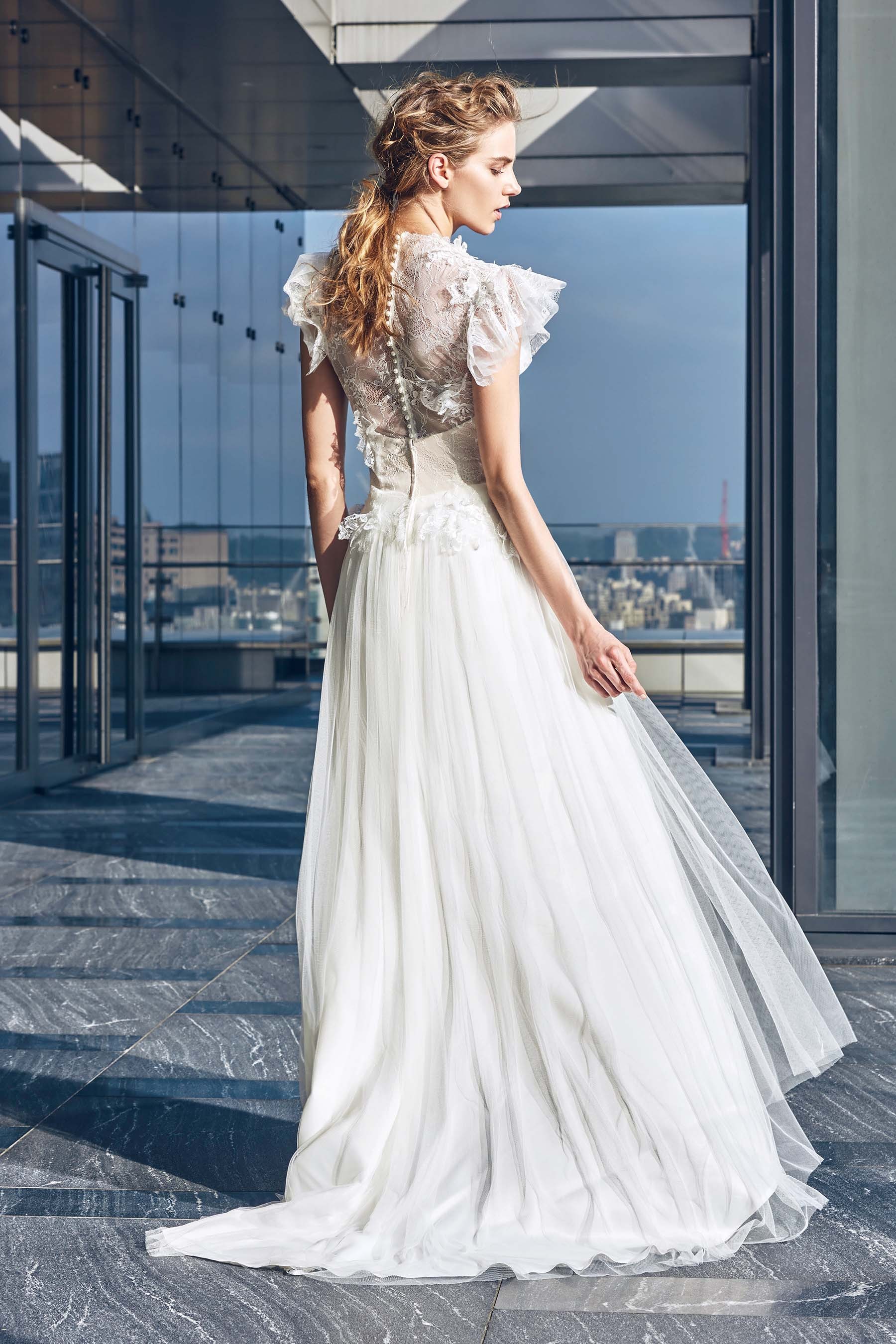 Rochia de mireasa ME122 din colectia Demetrios croita in stil boho, cu corsetul imbracat in dantela, cu umeri supradimensionati din organza fina. Este o rochie superba pentru nunti in locuri neconventionale.
