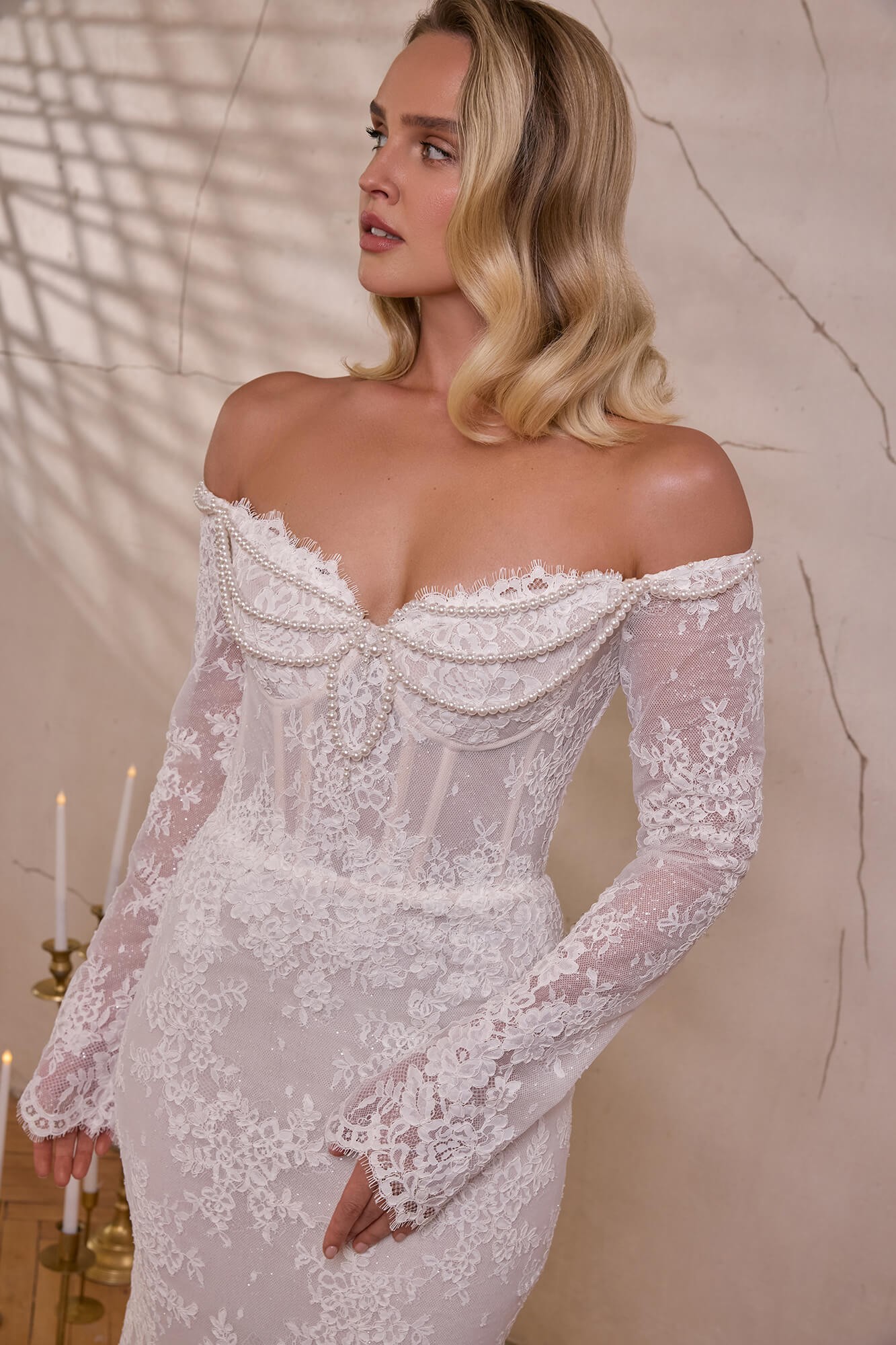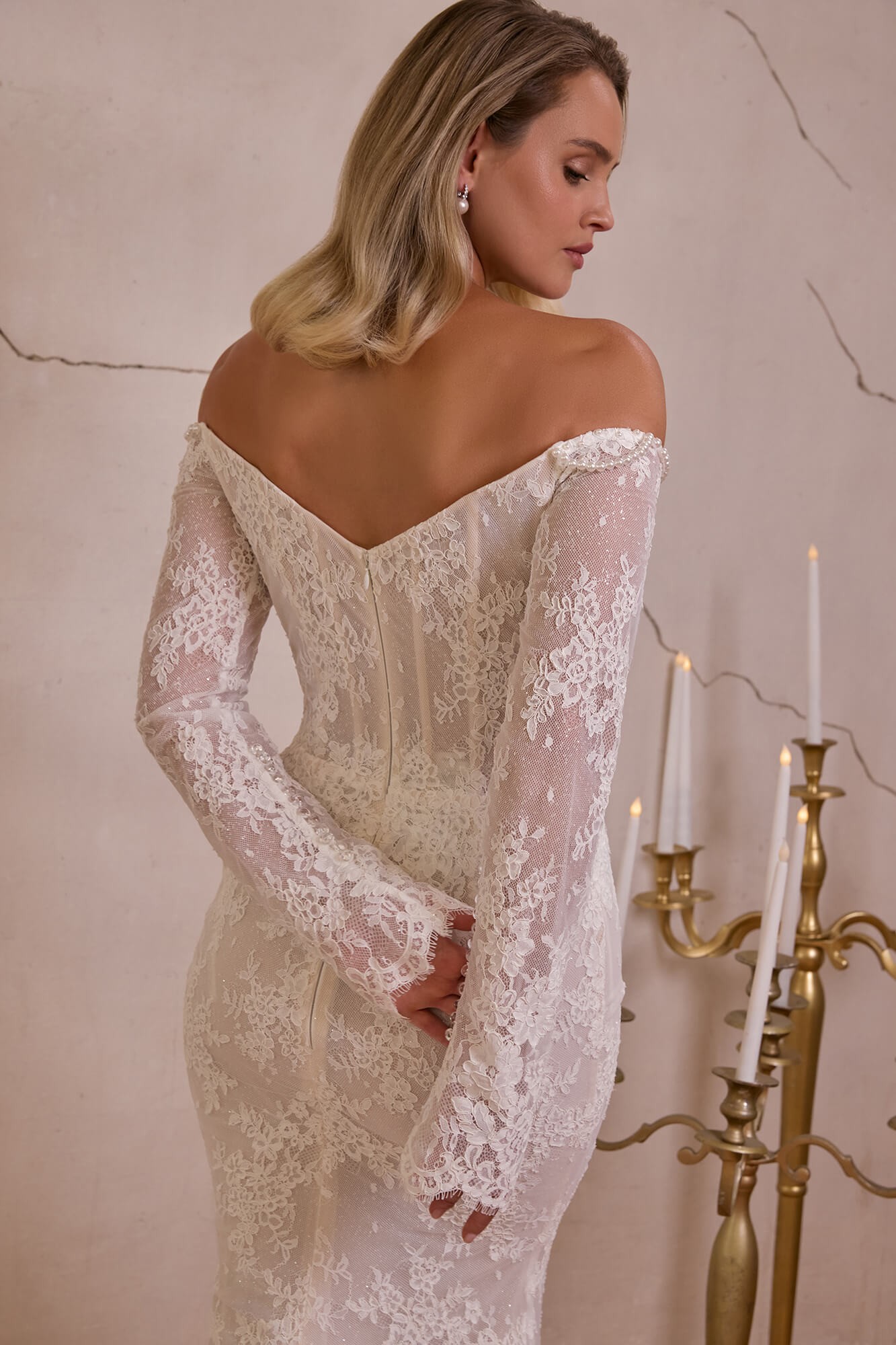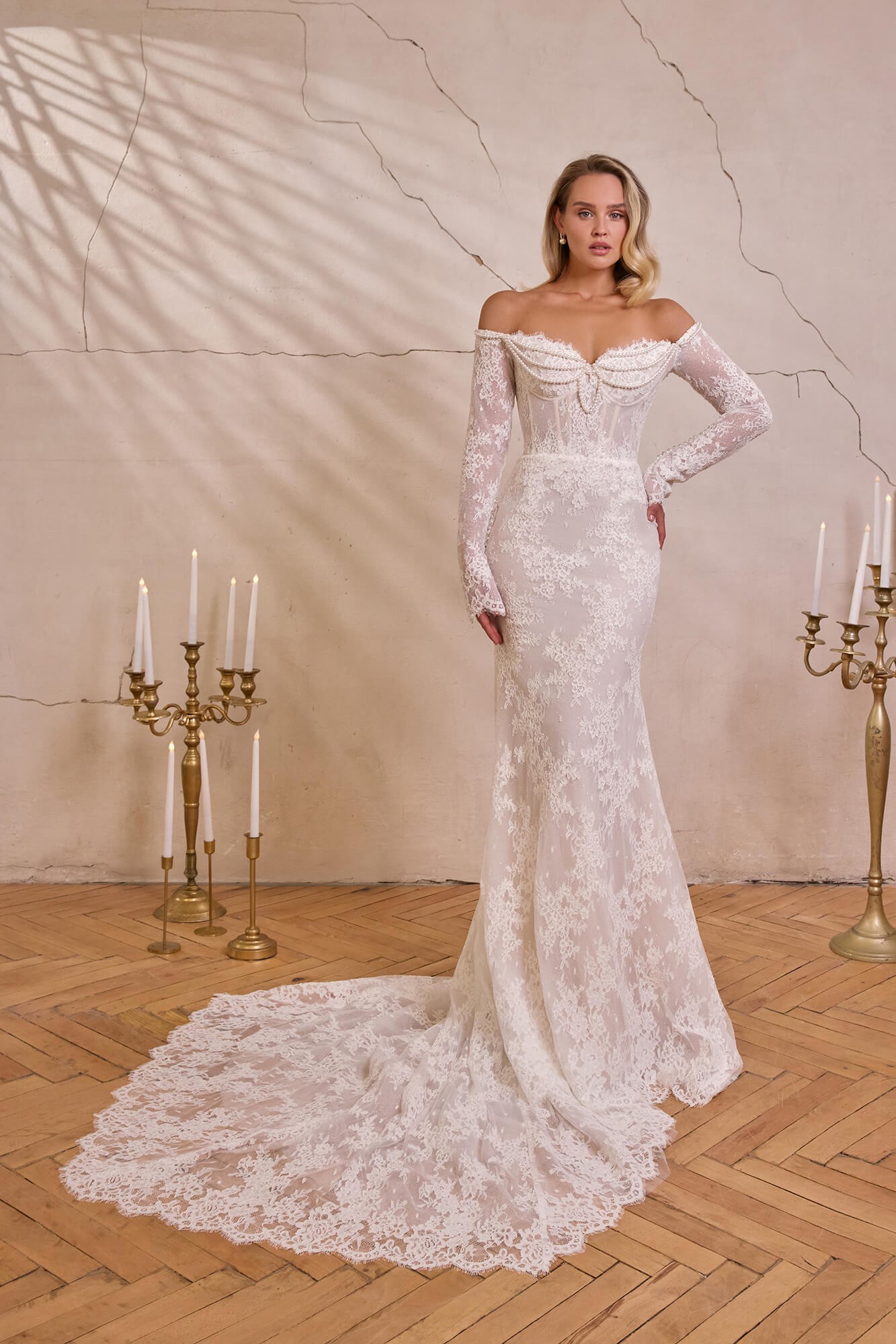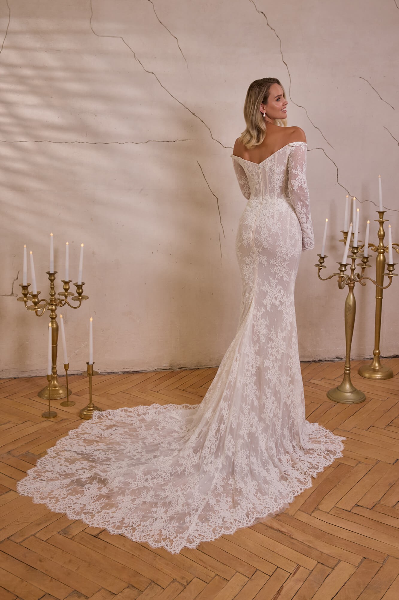 Combinația dintre umerii dezgoliți, care emană senzualitate, și mânecile lungi din dantelă, ce adaugă noblețe și echilibru, creează un look armonios și memorabil. Croiala tip sirenă urmărește delicat silueta, evidențiind formele, iar trena din dantelă completează apariția cu un plus de solemnitate și grandoare.