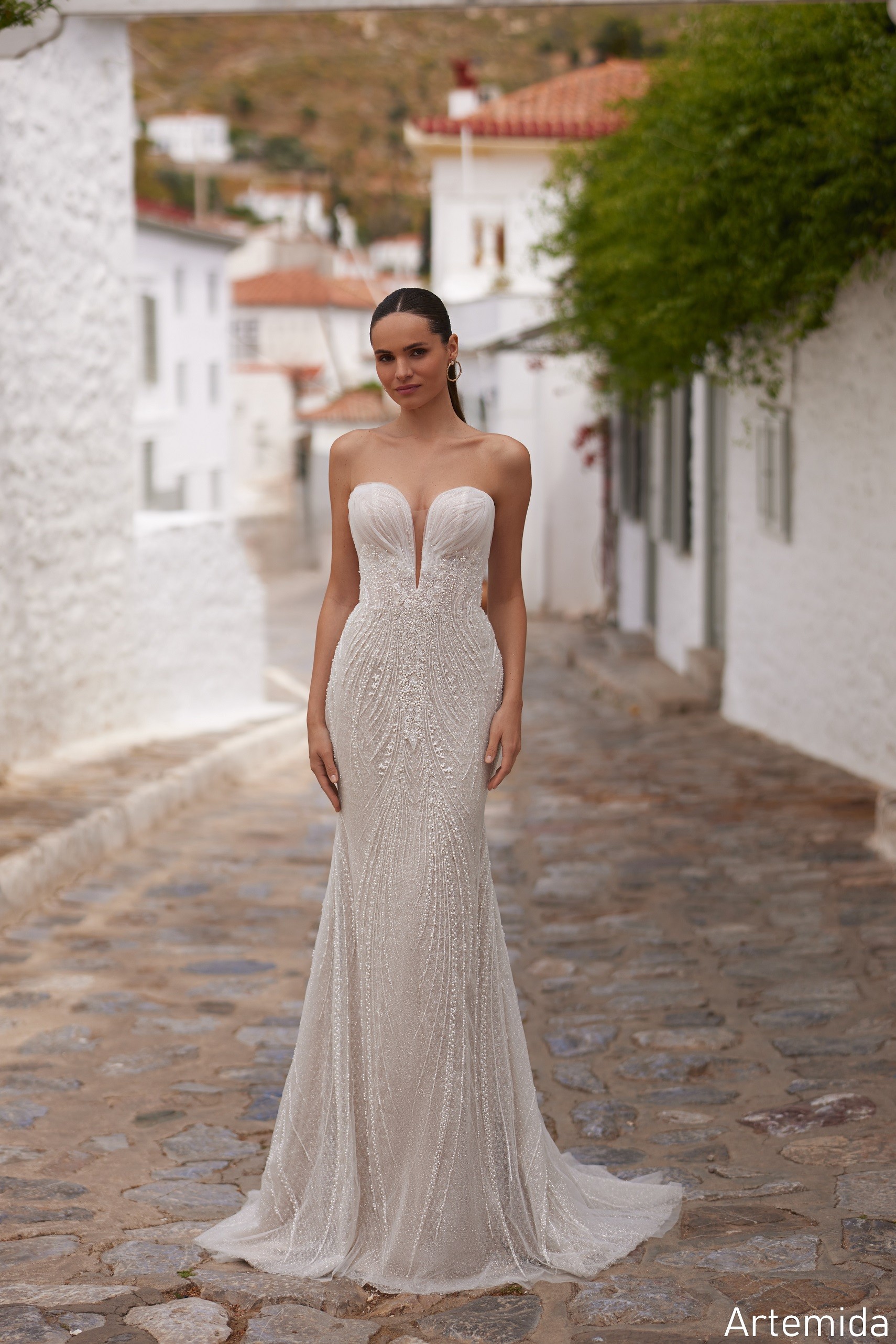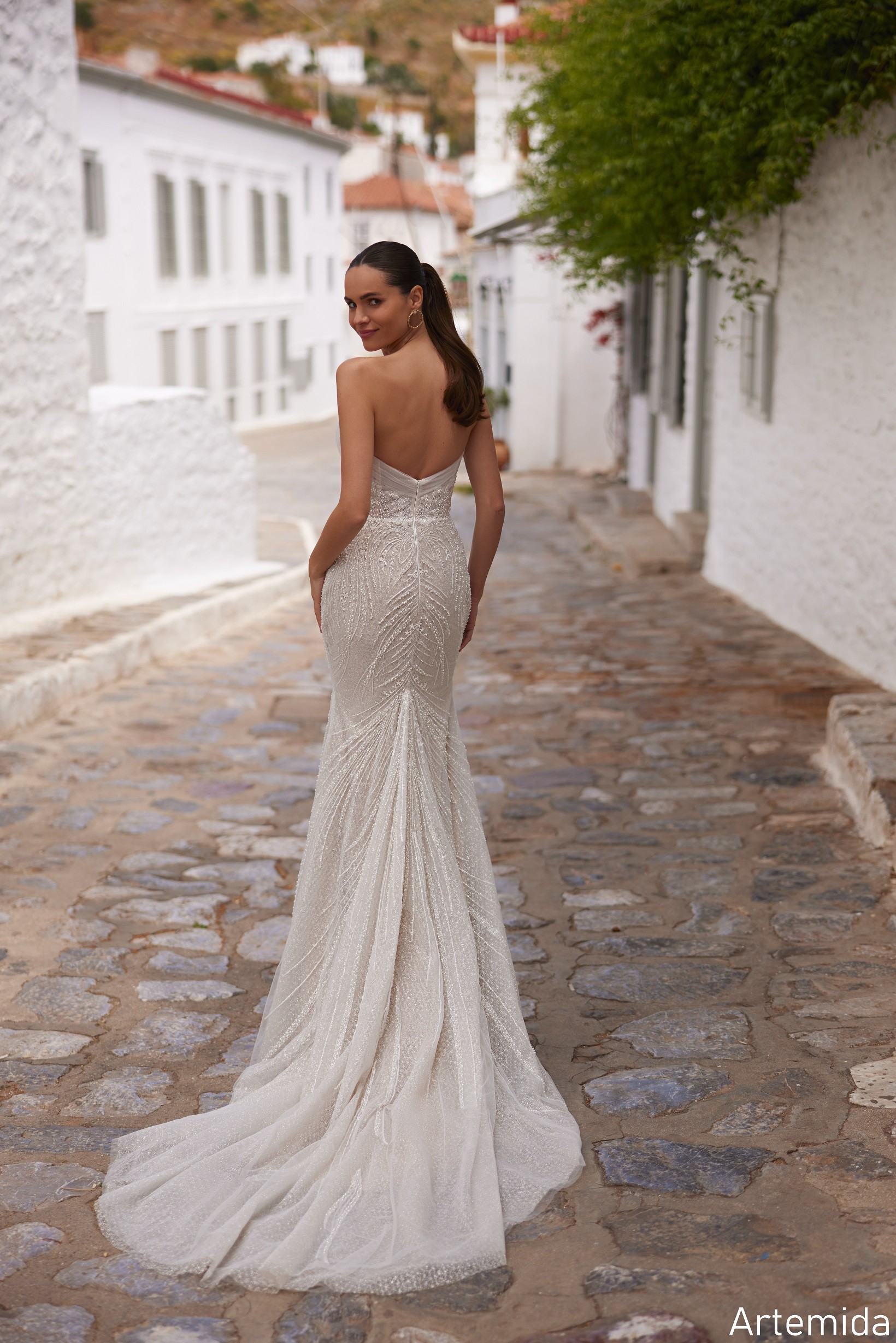 Rochia de mireasă Artemida impresionează prin croiala sirenă care evidențiază perfect liniile feminine și prin corsetul fără bretele, cu un decolteu adânc în V, creat pentru un impact vizual puternic. Realizată din tulle fin și broderii strălucitoare, rochia creează o textură luxoasă, fluidă, ce adaugă profunzime și rafinament. Designul sofisticat și finisajele premium transformă acest model într-o alegere ideală pentru miresele care își doresc un look elegant, modern și senzual în ziua nunții.