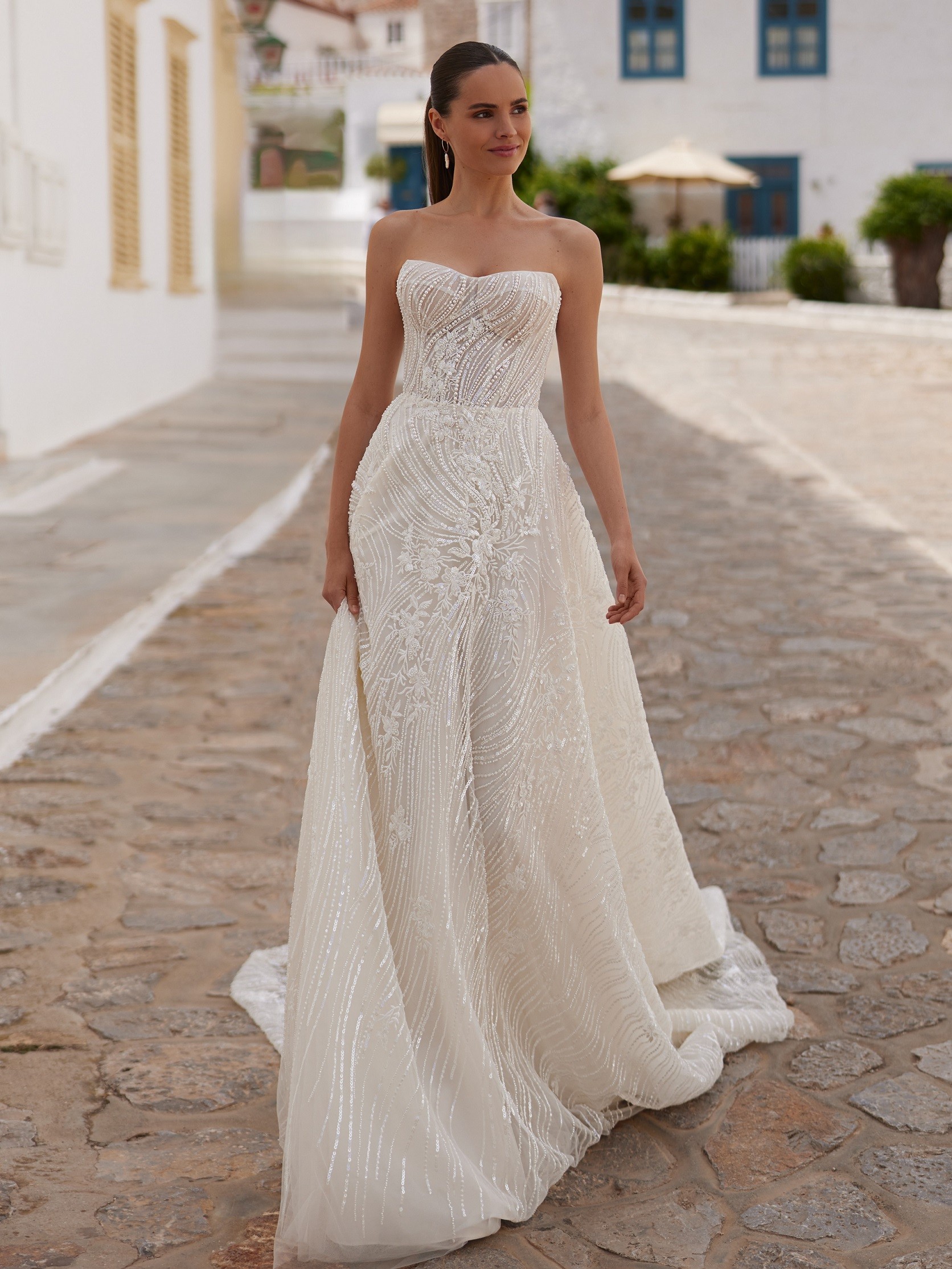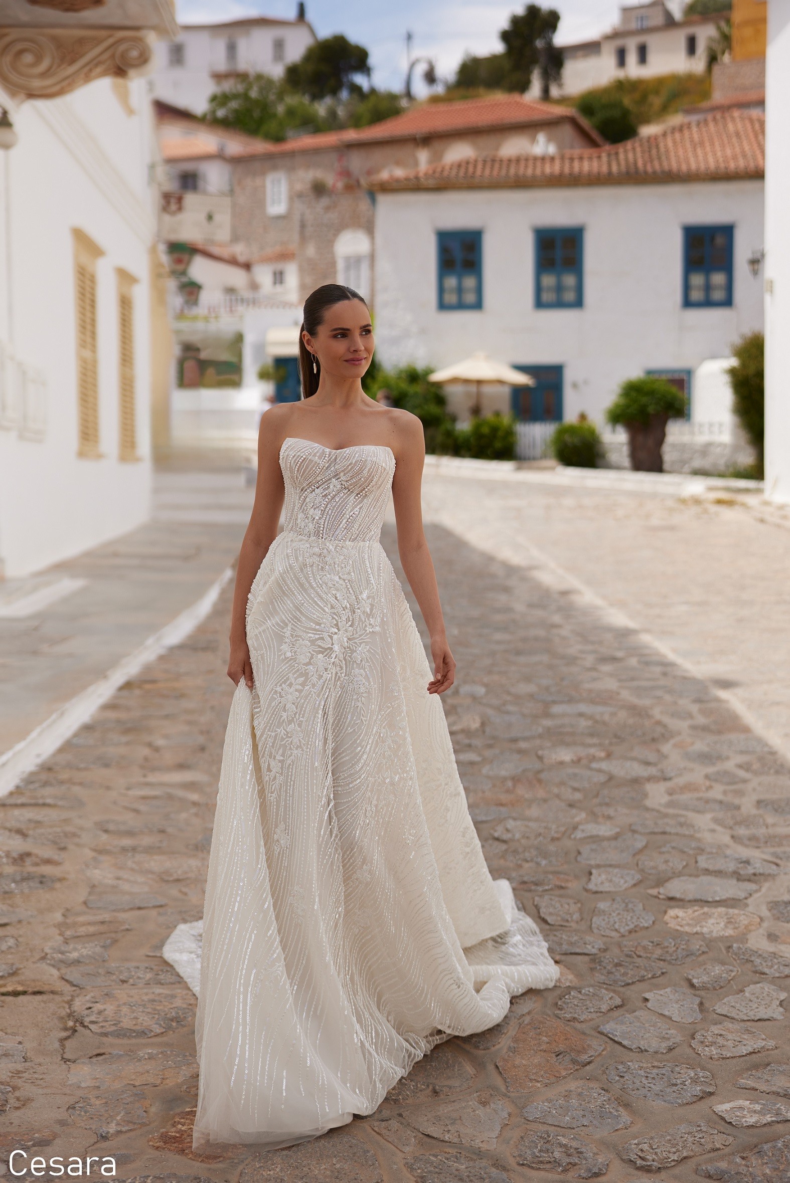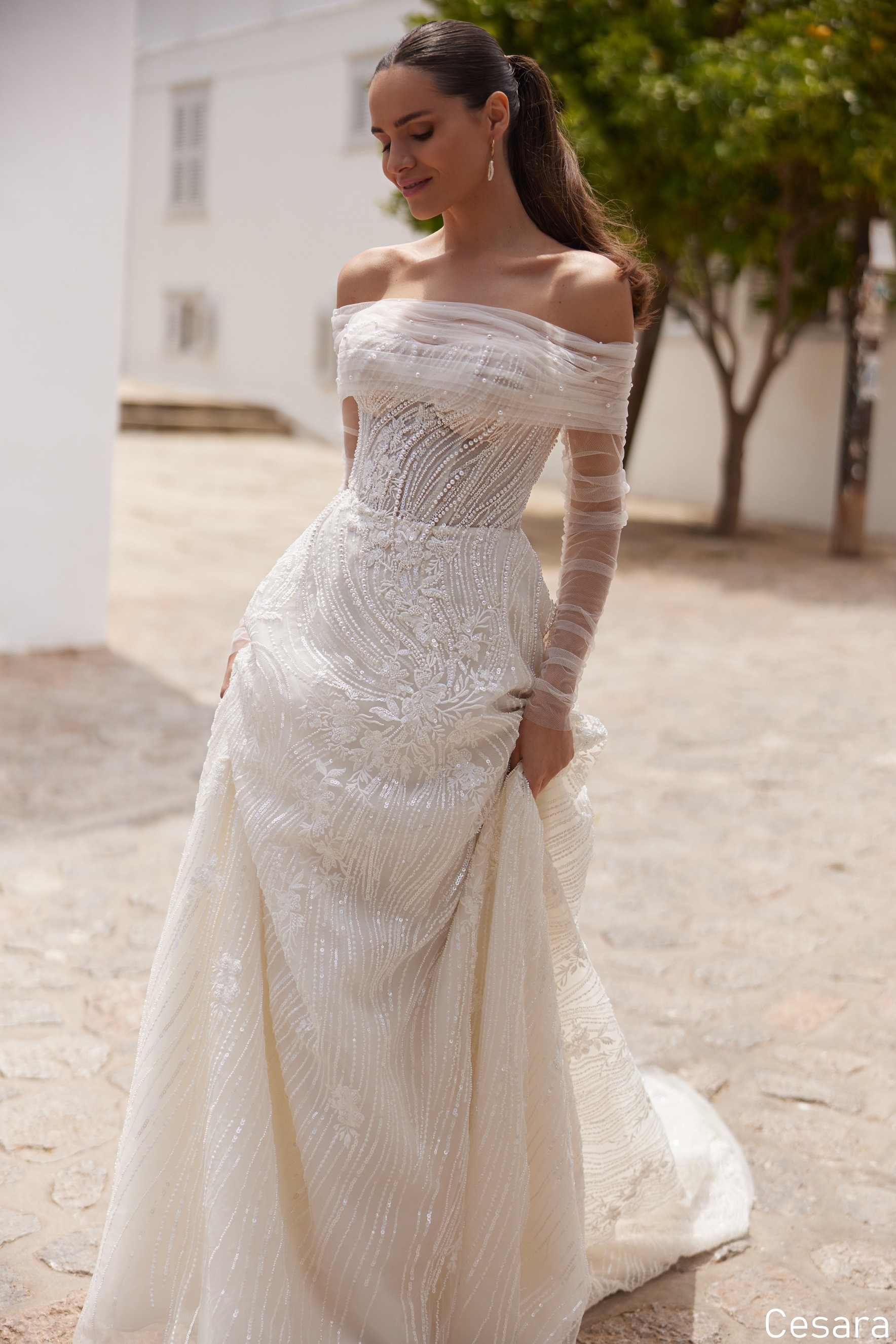 Rochia de mireasă „Cesara” impresionează prin eleganță și detalii couture. Bustul fără bretele, perfect structurat, evidențiază linia umerilor, iar fusta amplă din tulle premium este îmbogățită cu broderii fine și accente irizate care oferă strălucire discretă. Silueta A-line alungește vizual corpul, iar trena ușoară adaugă rafinament întregii apariții. O rochie modernă, sofisticată și atemporală, creată pentru mireasa care își dorește un look luminos și impecabil în ziua nunții.
