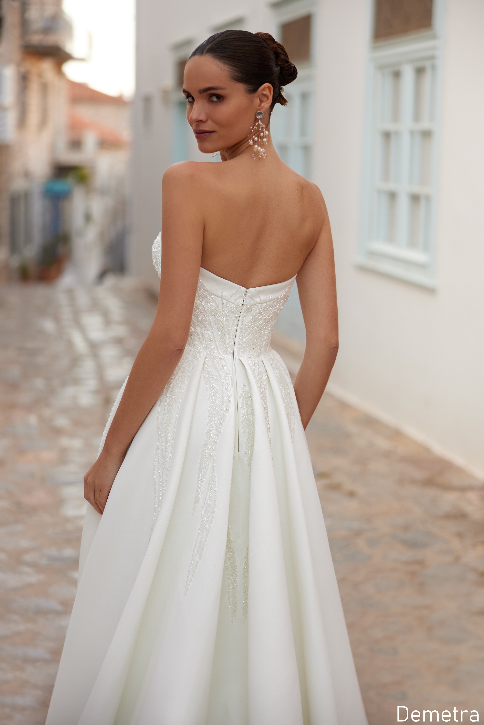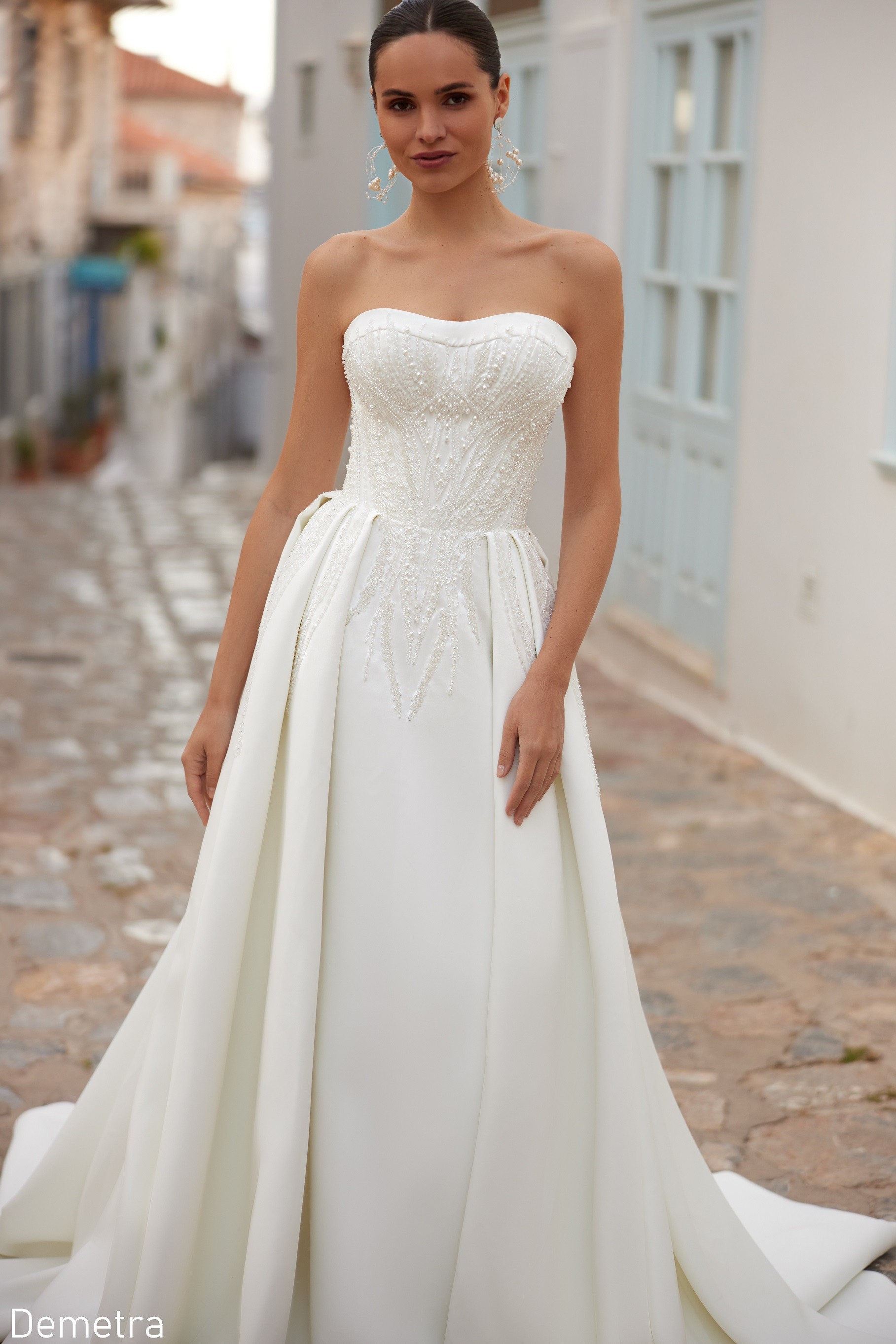 Rochia de mireasă Demetra îmbină rafinamentul clasic cu detalii couture moderne. Bustul fără bretele, perfect structurat, este decorat cu broderii fine ce conturează armonios silueta, oferind un aspect elegant și luminos. Fusta amplă, realizată din material premium cu cădere impecabilă, creează un volum sofisticat și o prezență regală, ideală pentru miresele care își doresc un look atemporal.