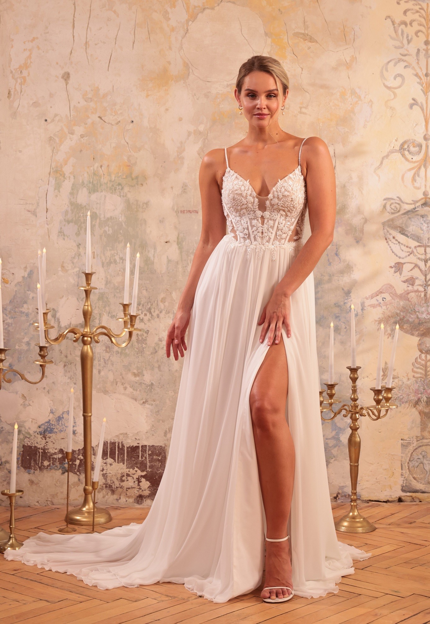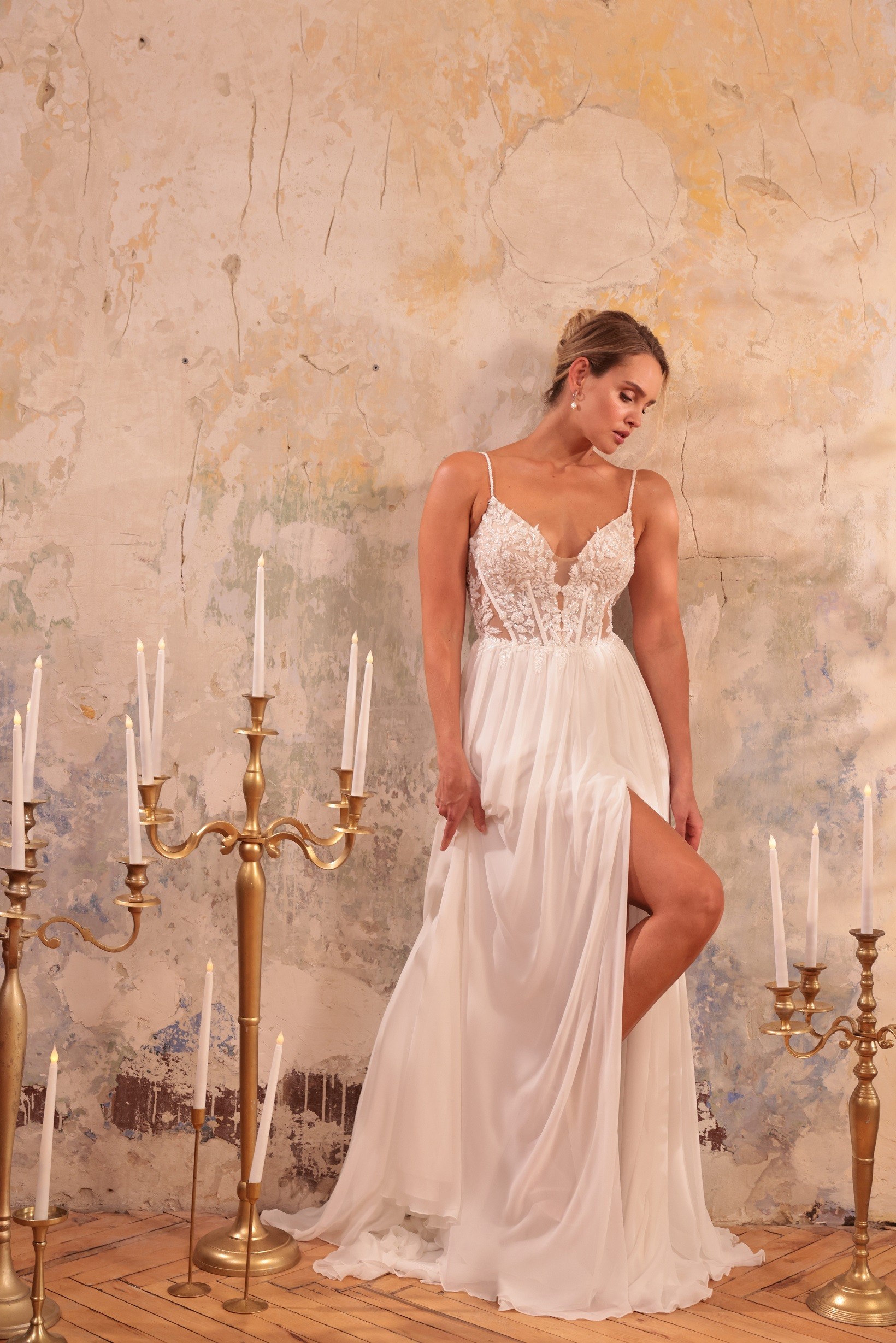 Această rochie de mireasă modernă este alegerea perfectă pentru miresele care își doresc un look diafan, feminin și actual, ideal pentru nunți elegante, beach wedding sau ceremonii în aer liber.