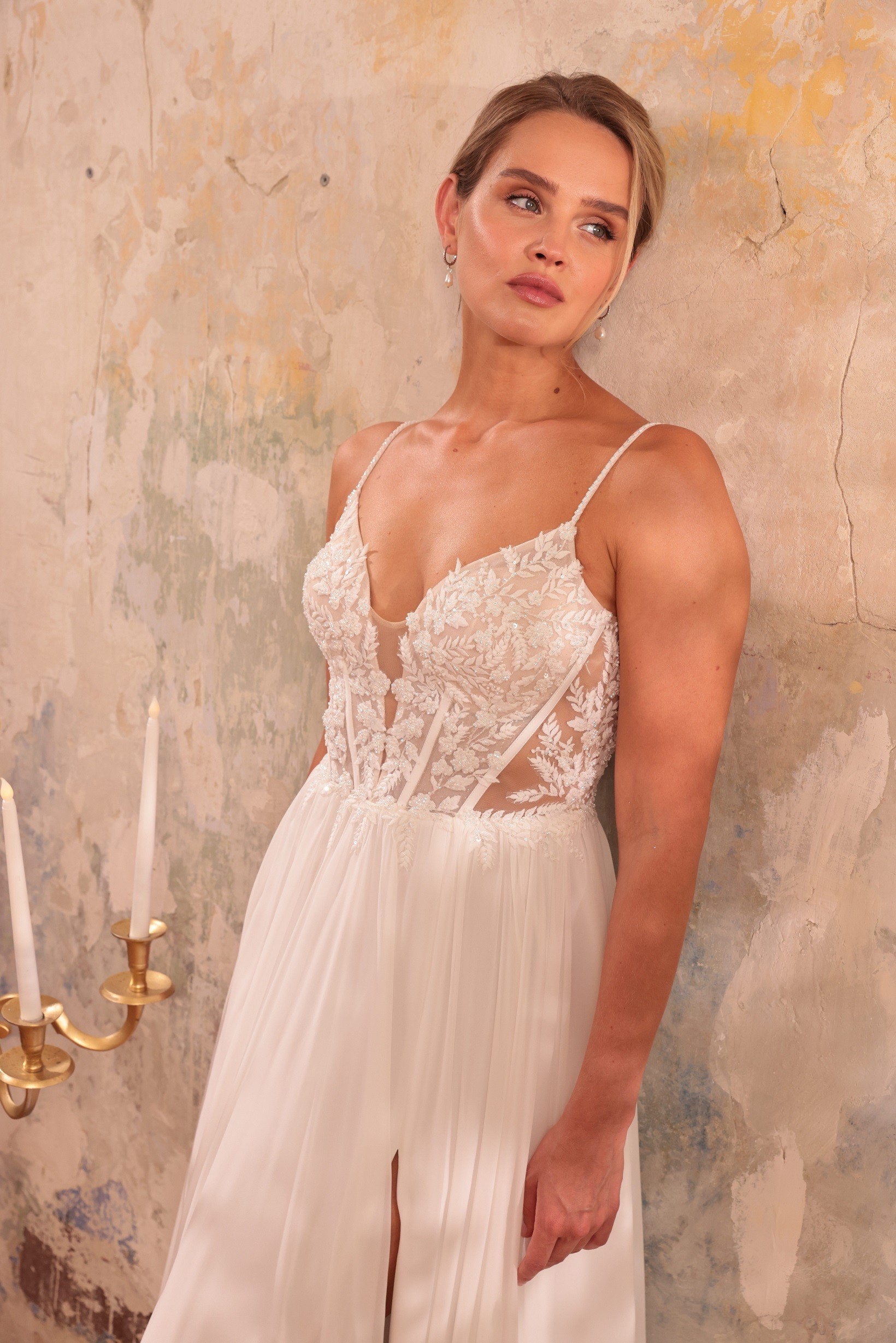 Fusta vaporoasă din chiffon ivory, cu despicătură adâncă, aduce lejeritate și fluiditate, creând un contrast perfect cu bustul delicat din dantelă. Întregul design este expresia ideală a senzualității moderne îmbinată cu gingășia, punând în valoare feminitatea naturală a miresei.