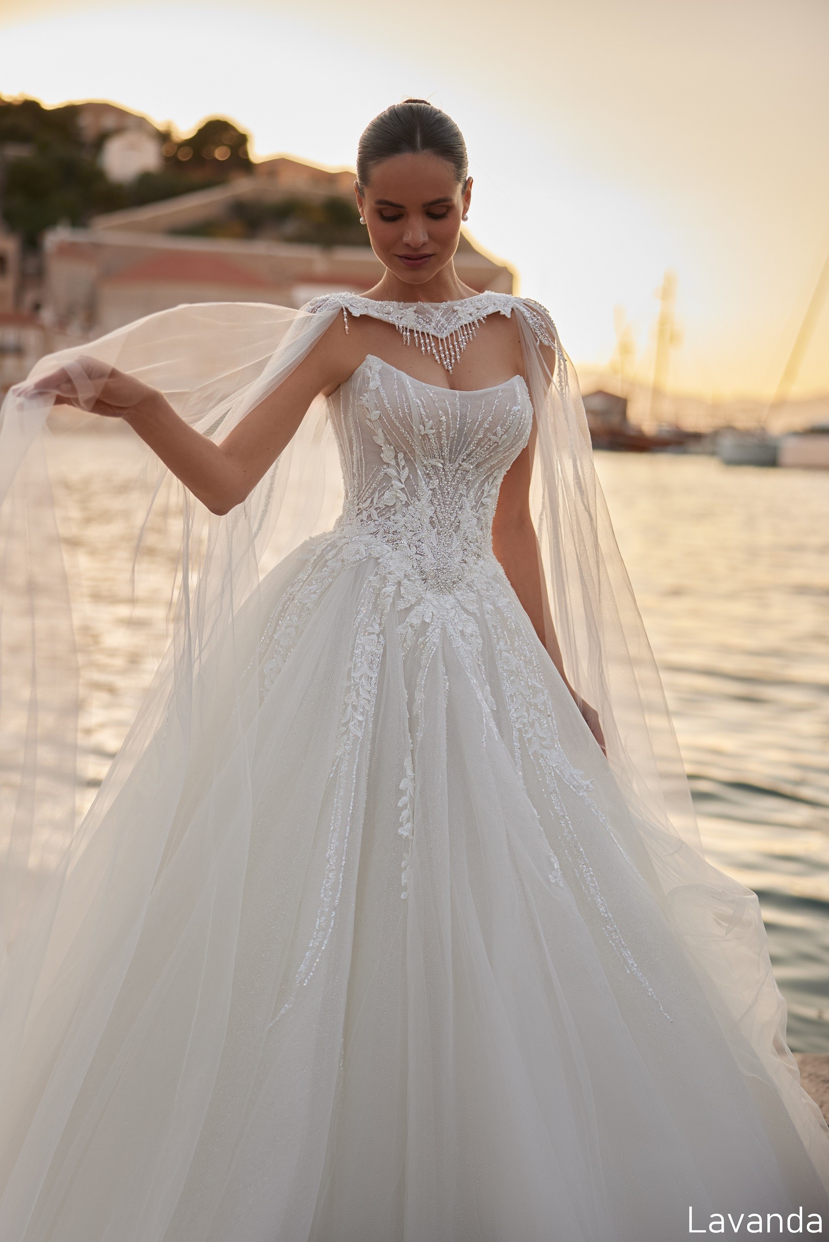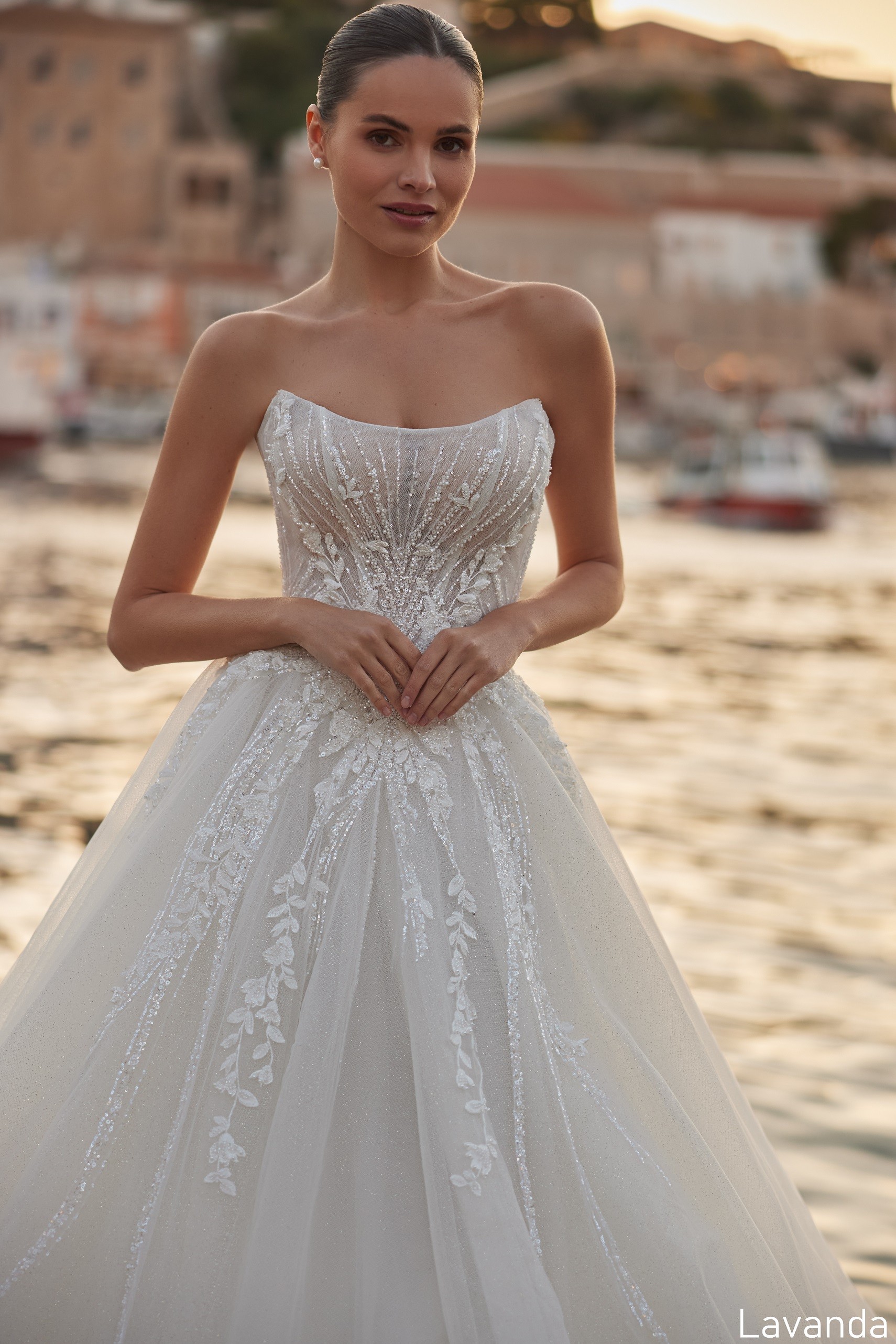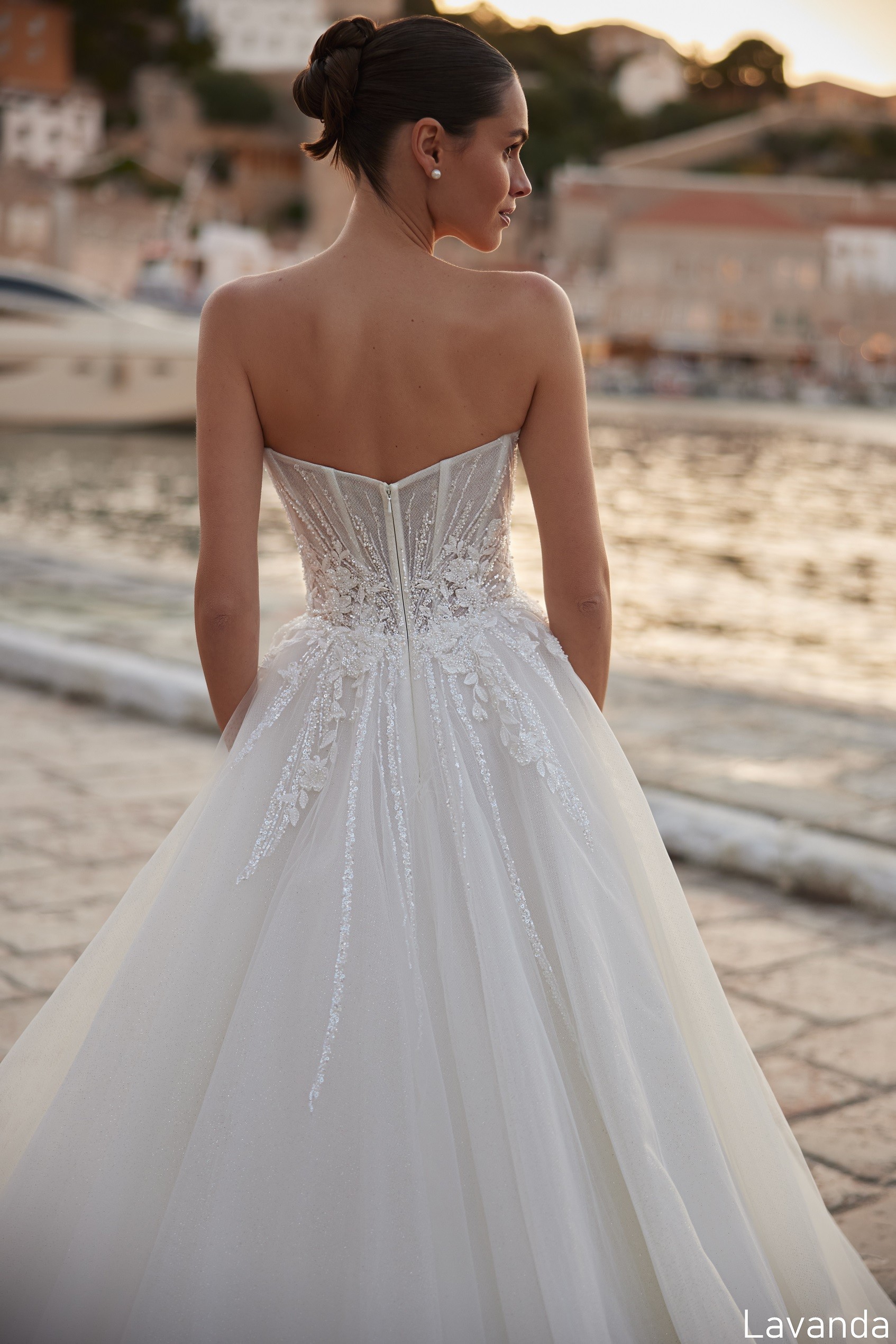 Lavanda este o rochie de mireasă tip prințesă, cu fustă amplă din tulle fin și un corset spectaculos decorat cu broderii și aplicații florale strălucitoare. Decolteul drept conferă eleganță clasică, iar detaliile subtile glitter adaugă un efect luminos, perfect pentru miresele care își doresc un look regal, romantic și memorabil.