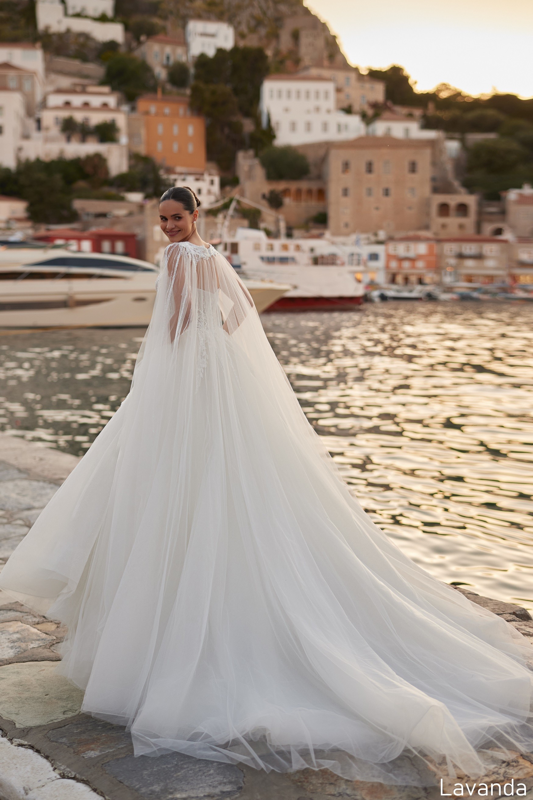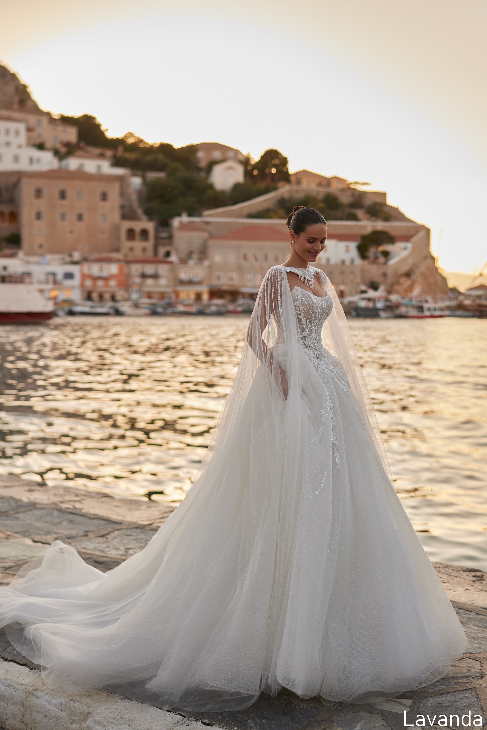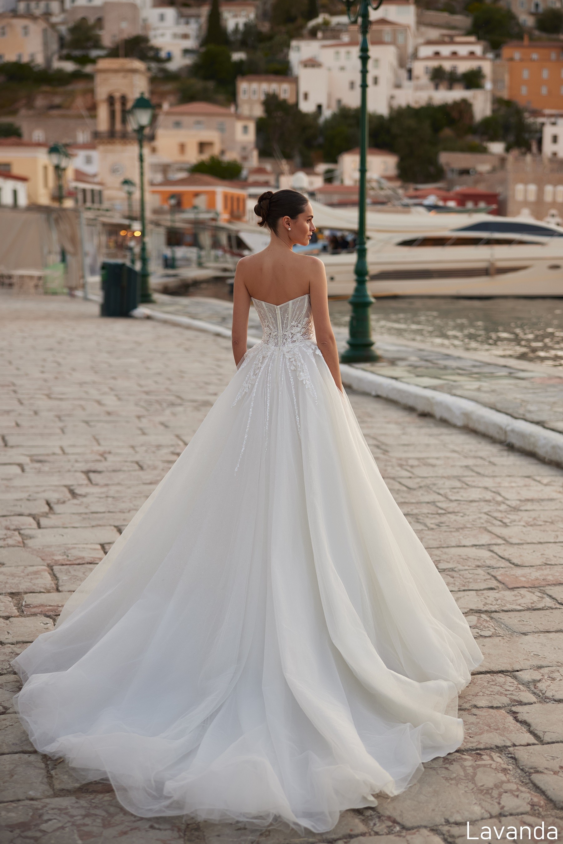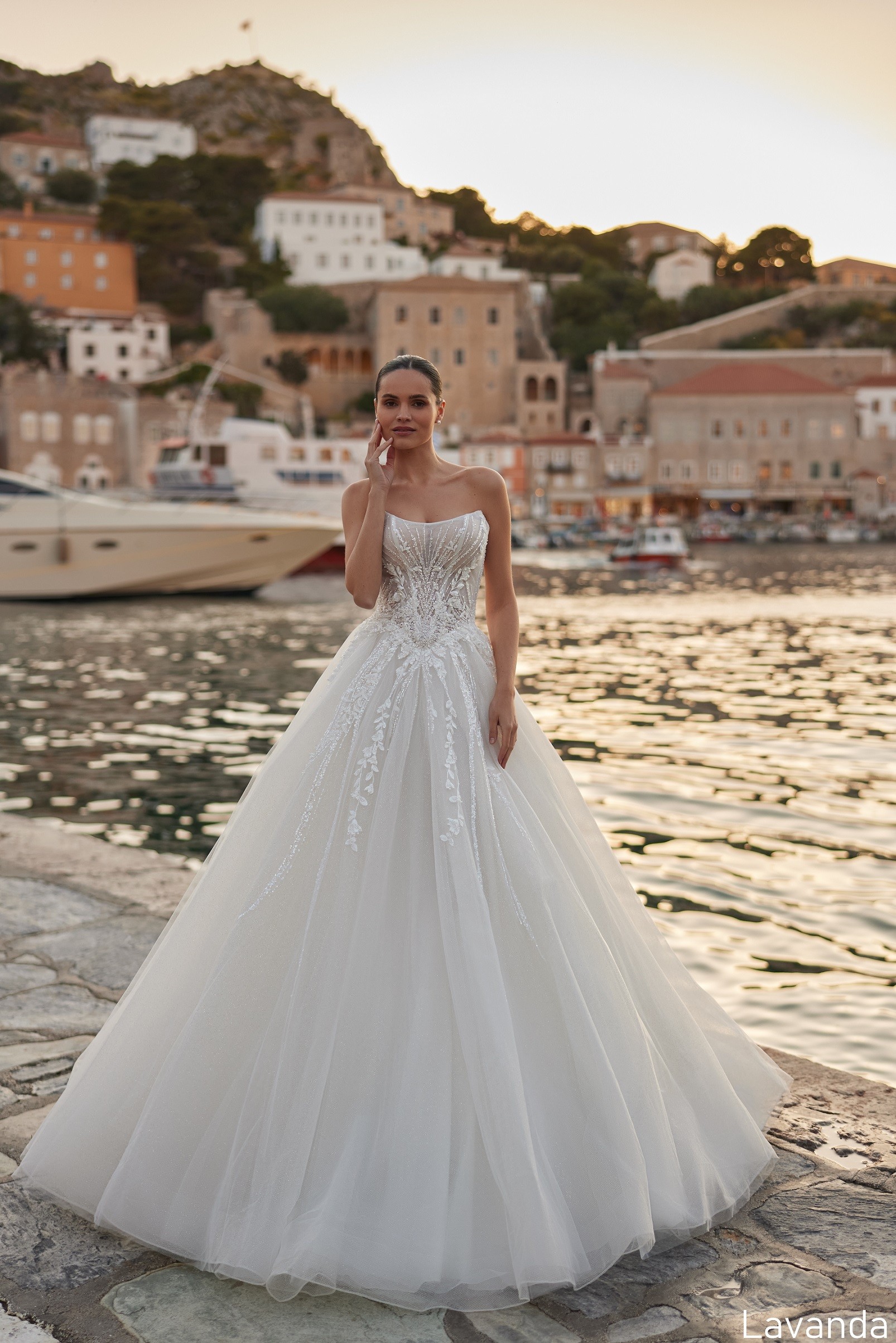 Lavanda este o rochie de mireasă tip prințesă, cu fustă amplă din tulle fin și un corset spectaculos decorat cu broderii și aplicații florale strălucitoare. Decolteul drept conferă eleganță clasică, iar detaliile subtile glitter adaugă un efect luminos, perfect pentru miresele care își doresc un look regal, romantic și memorabil.