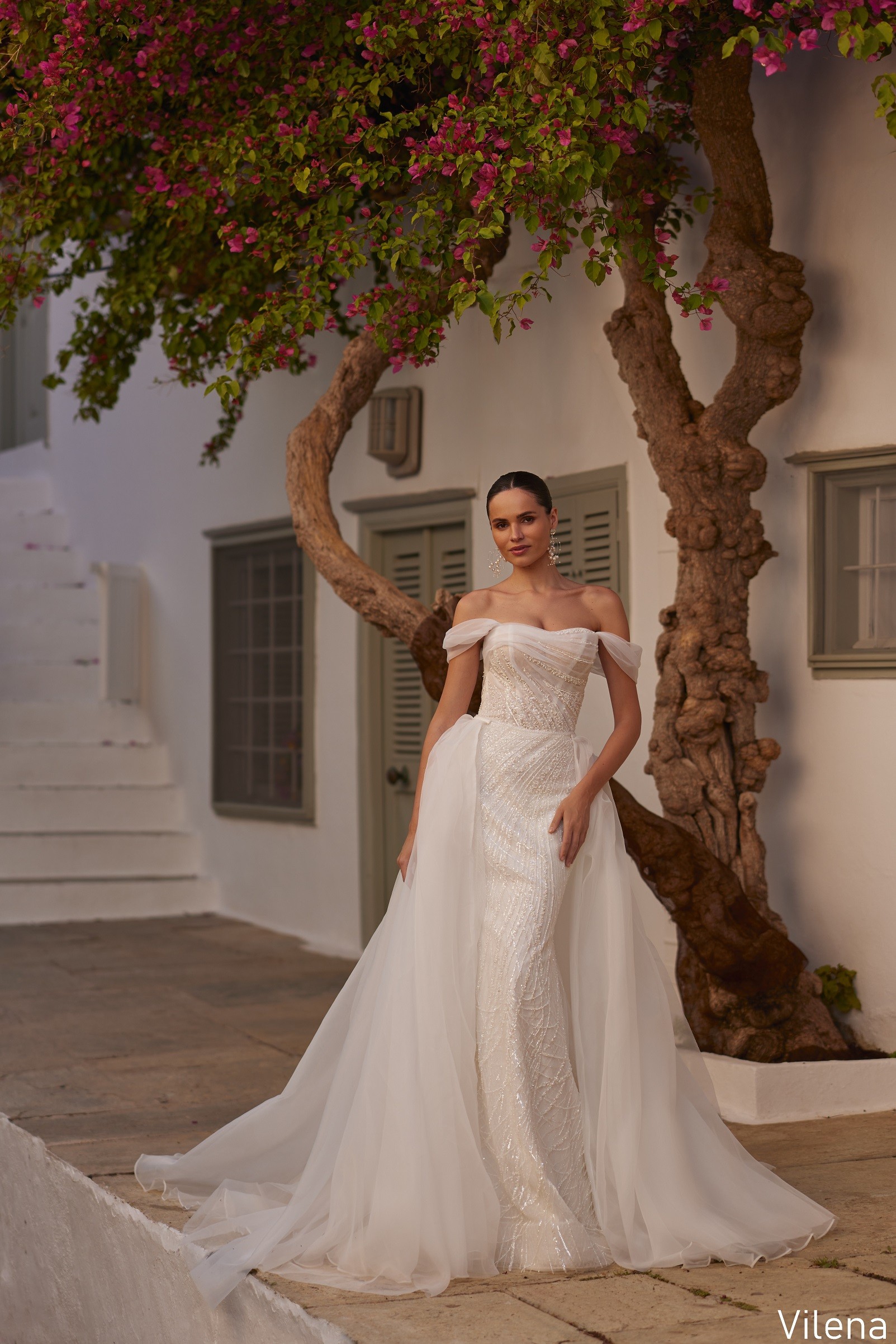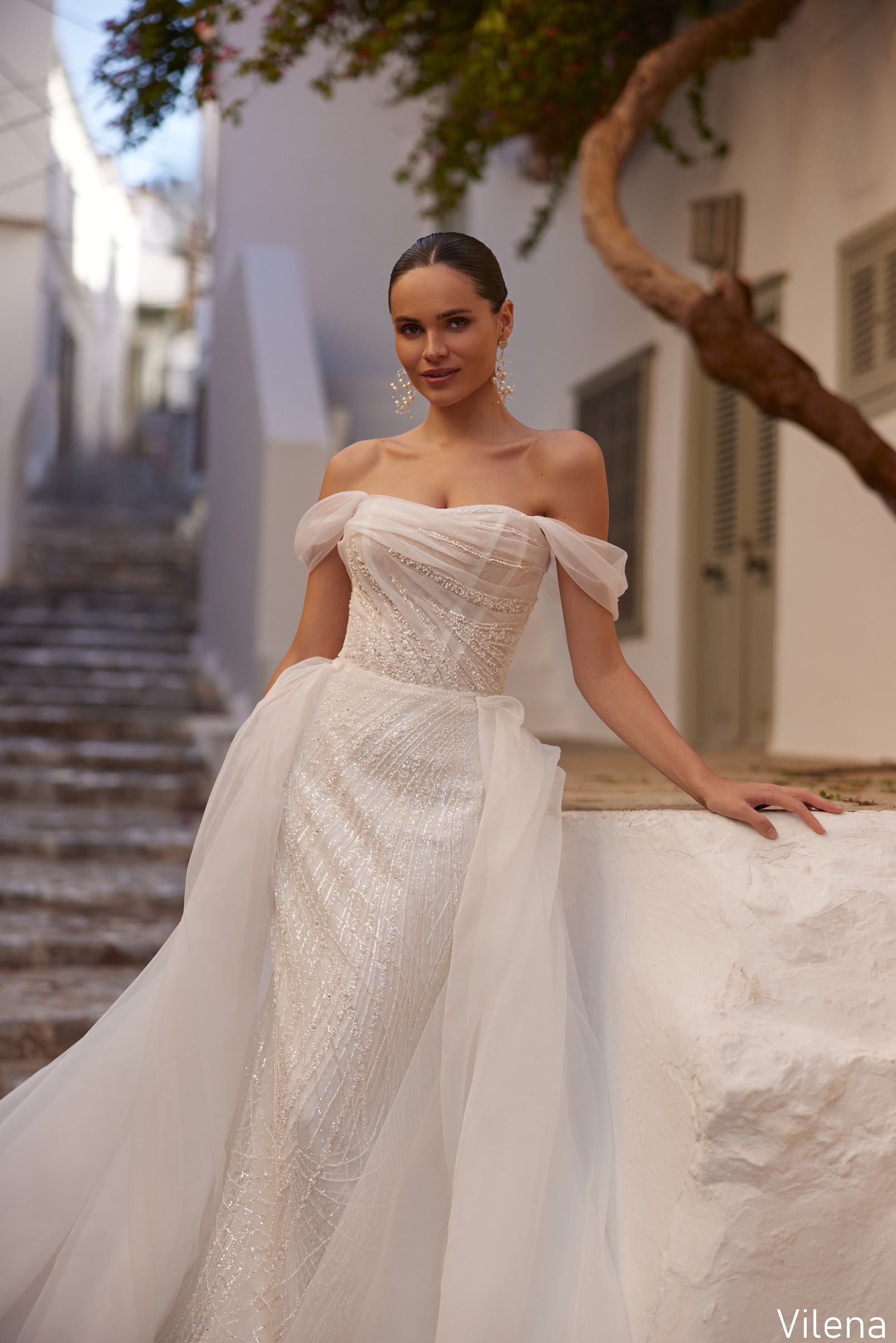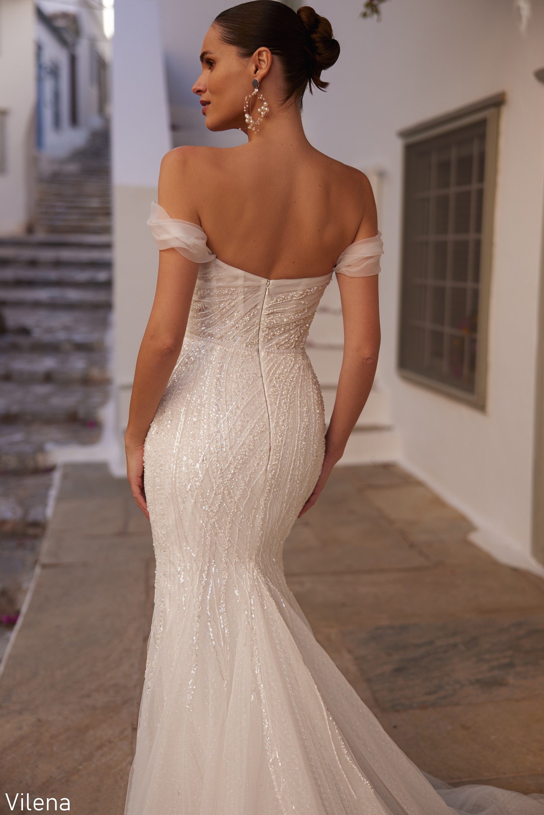 Rochia de mireasă Vilena îmbină liniile fluide ale croielii sirenă cu delicatețea unui corset drapat, cu mâneci căzute ce conturează umerii într-un mod romantic și irezistibil. Materialul fin, cu aplicații strălucitoare dispuse artistic, alungește vizual silueta și adaugă profunzime întregului design. Trena vaporoasă completează perfect eleganța rochiei, oferind un efect eteric și sofisticat.