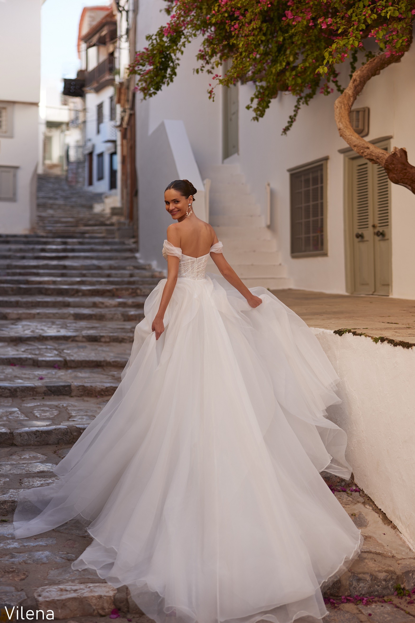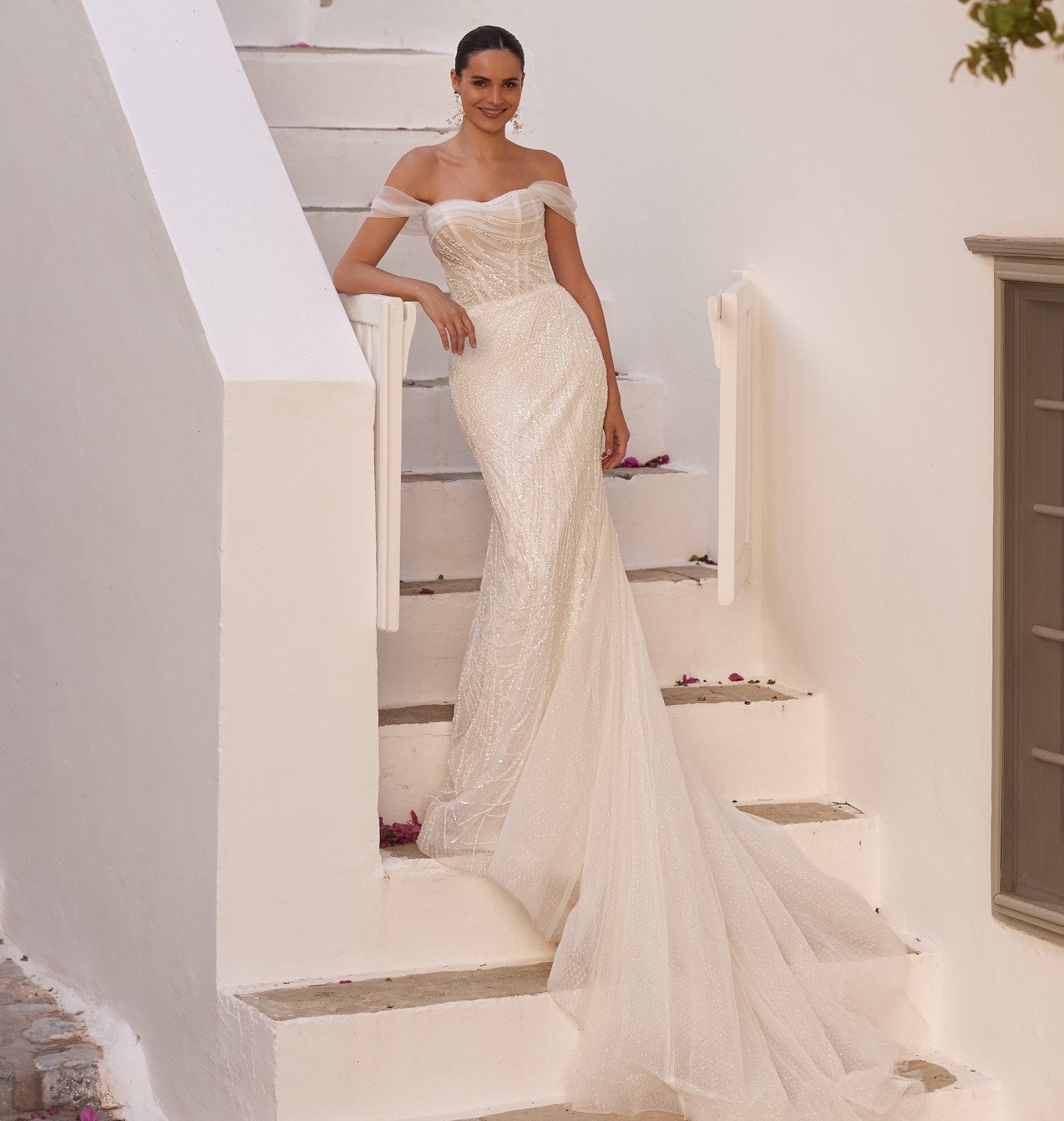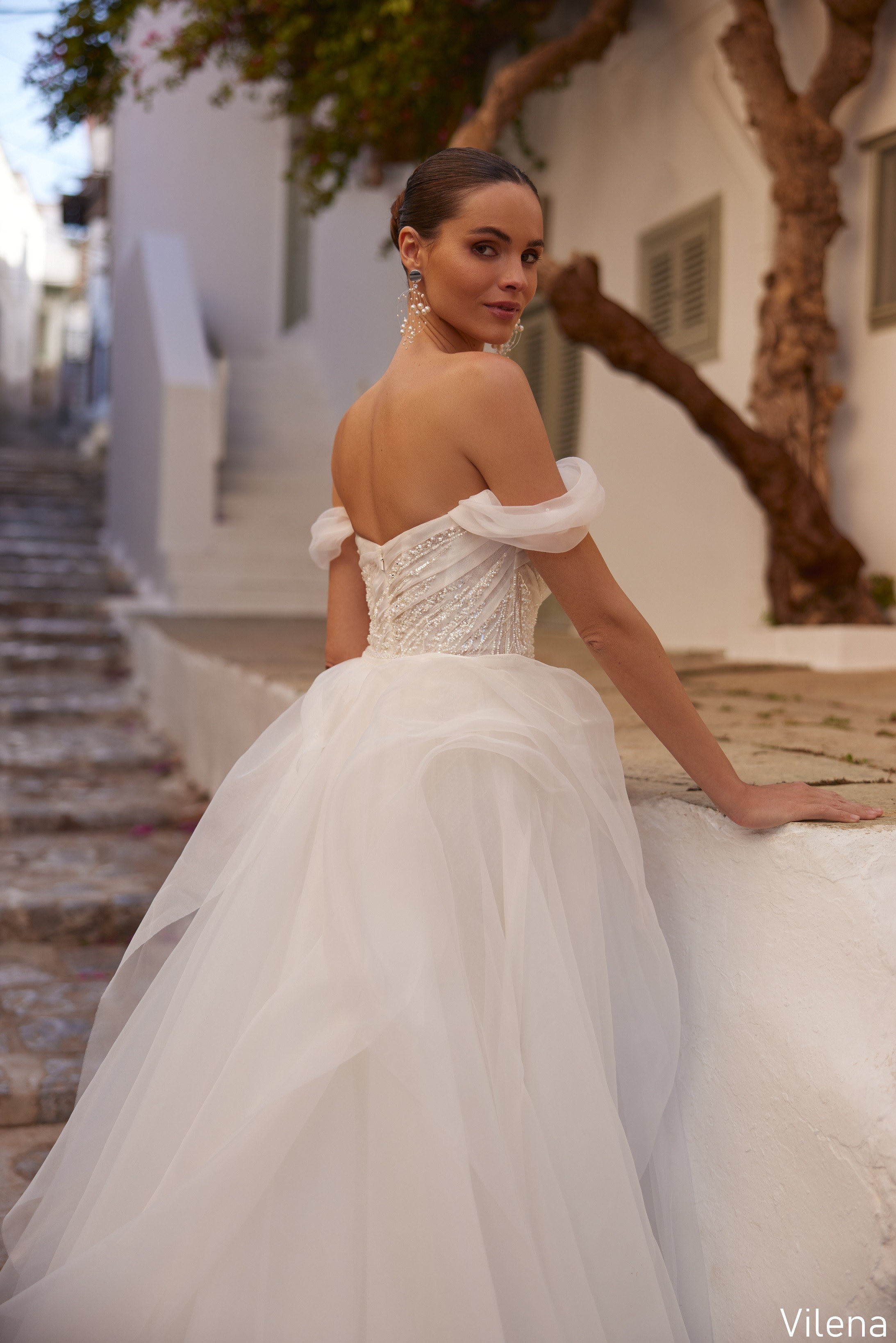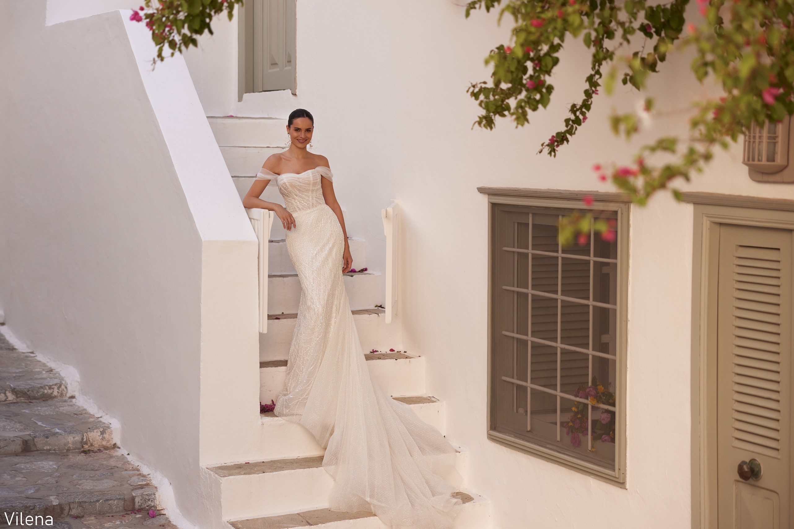 Rochia de mireasă Vilena îmbină liniile fluide ale croielii sirenă cu delicatețea unui corset drapat, cu mâneci căzute ce conturează umerii într-un mod romantic și irezistibil. Materialul fin, cu aplicații strălucitoare dispuse artistic, alungește vizual silueta și adaugă profunzime întregului design. Trena vaporoasă completează perfect eleganța rochiei, oferind un efect eteric și sofisticat.