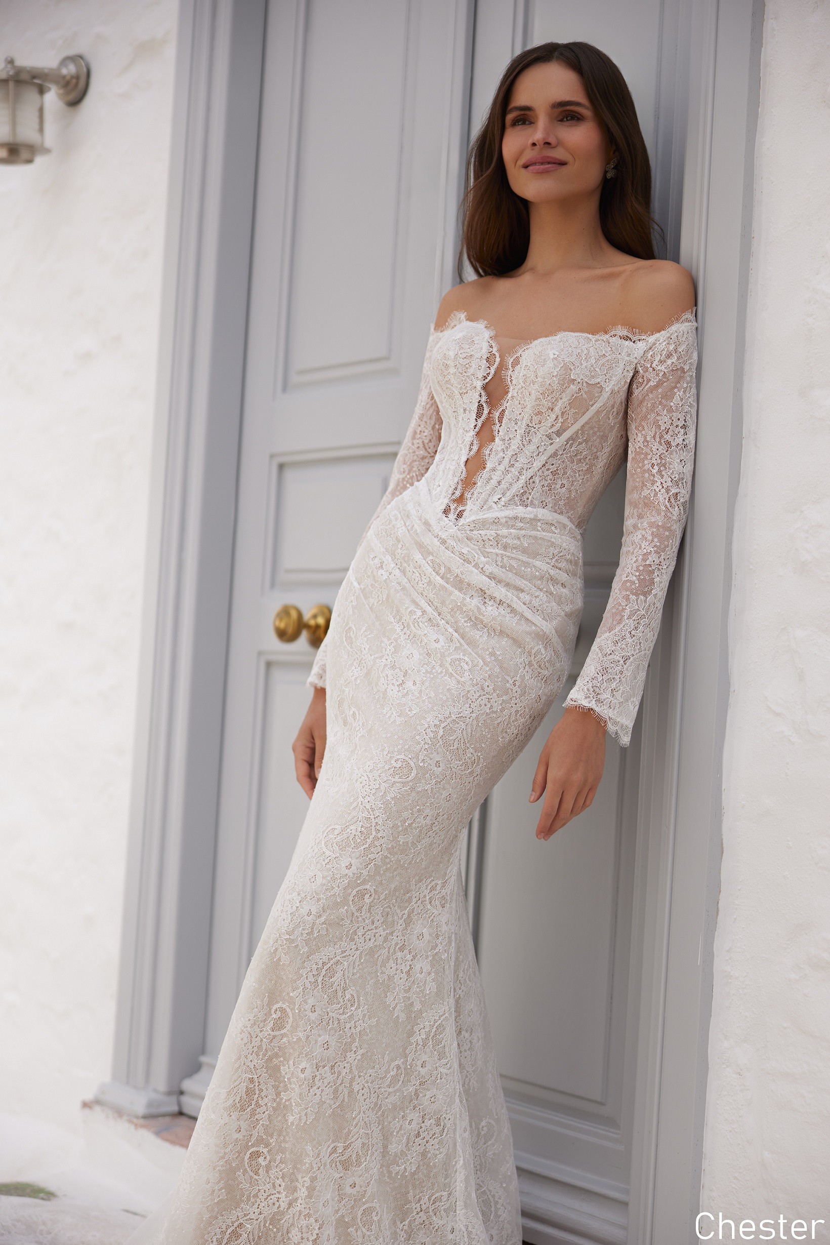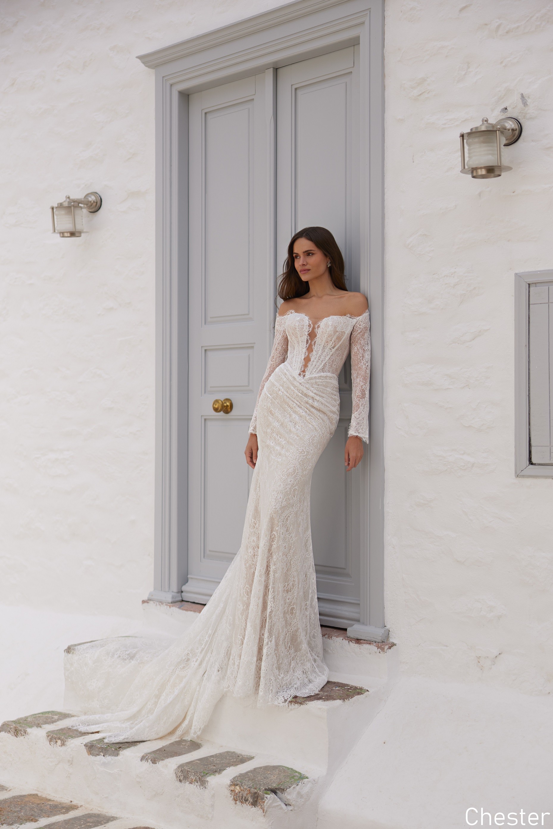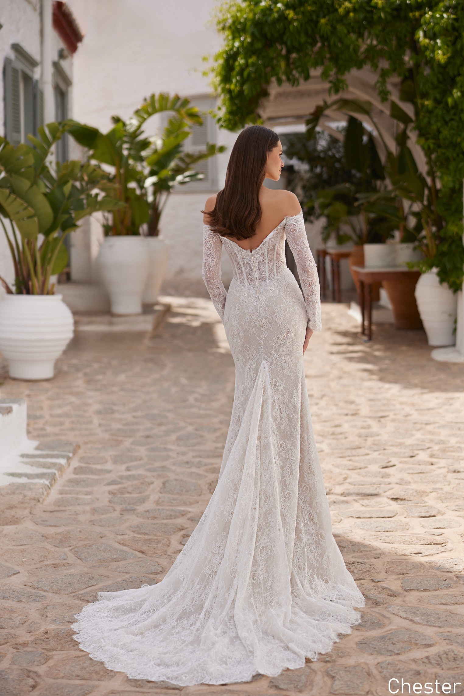 Chester este o rochie de mireasă tip sirenă, realizată din dantelă fină ce accentuează elegant formele. Decolteul adânc și umerii căzuți oferă un aer romantic și seducător, iar mânecile lungi din dantelă completează perfect designul. Trena delicată adaugă rafinament, transformând Chester în alegerea ideală pentru miresele care caută un look modern, feminin și atemporal.