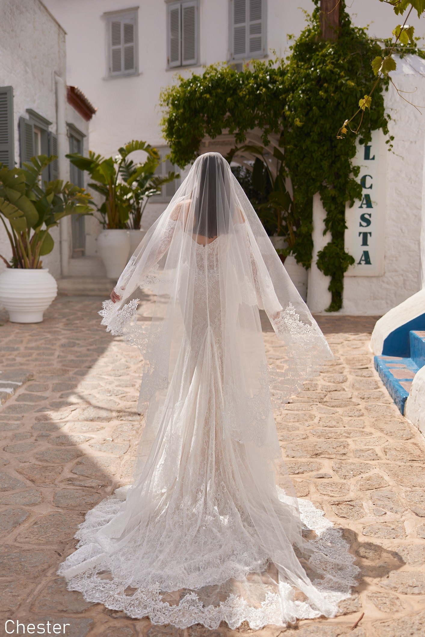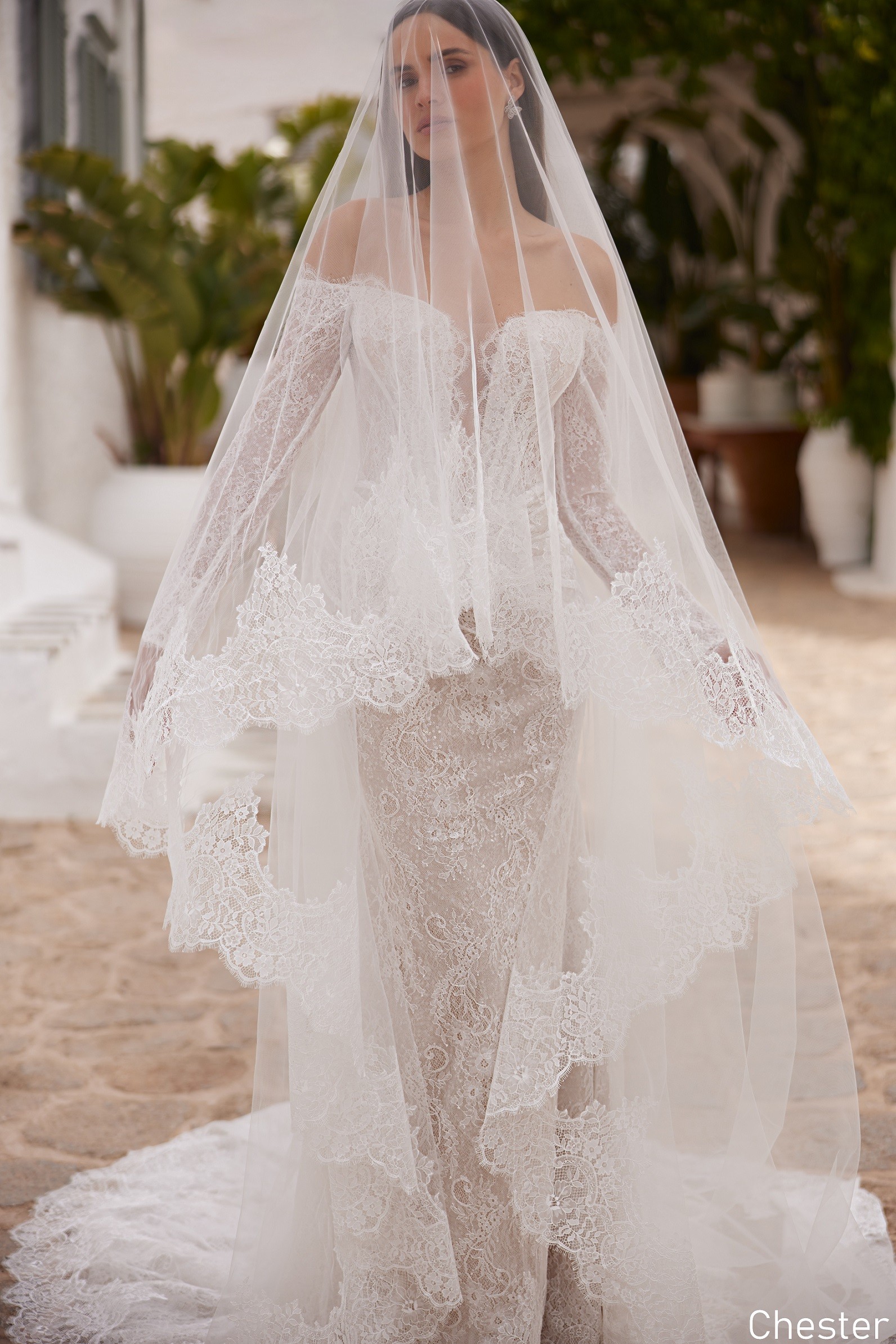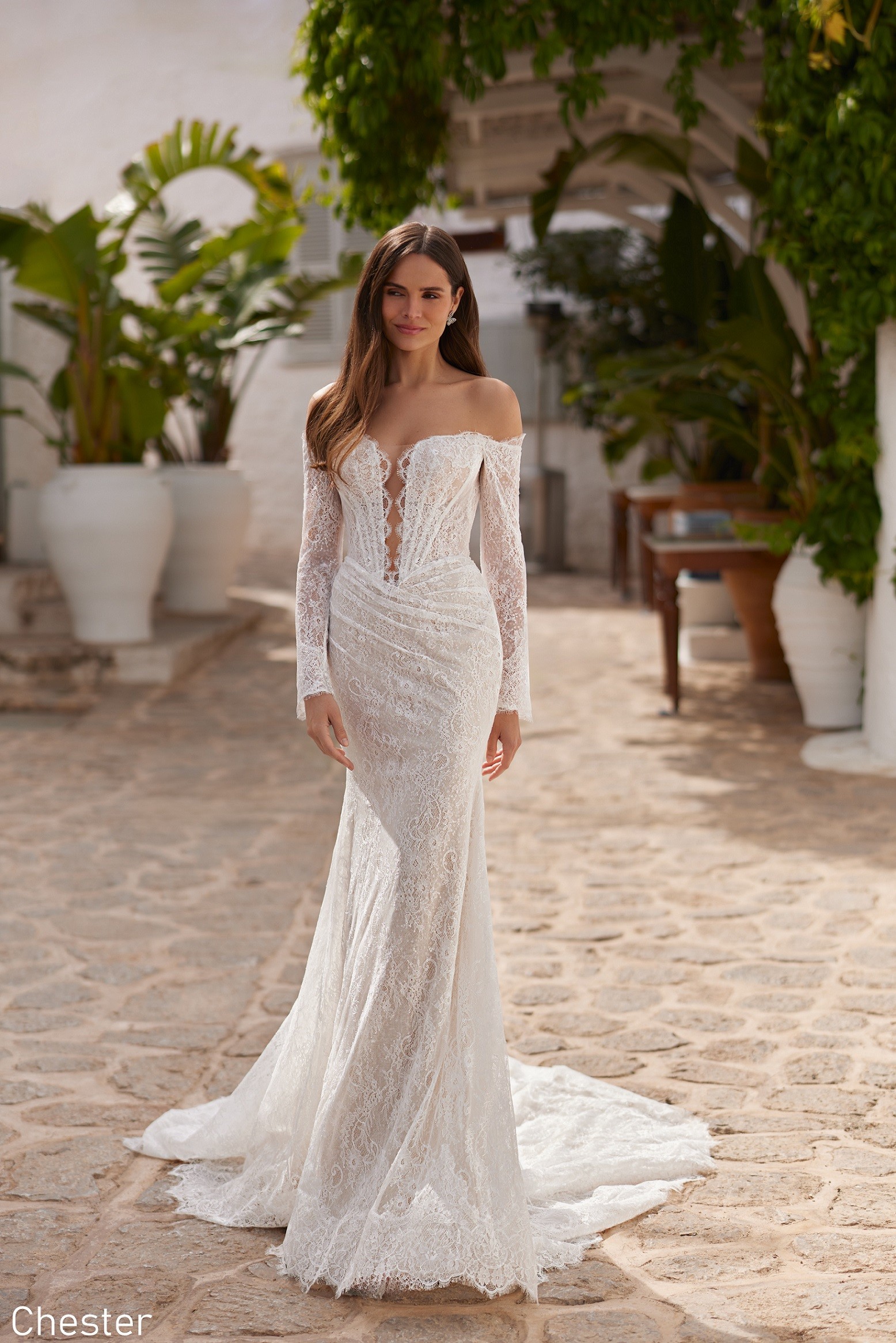 Chester este o rochie de mireasă tip sirenă, realizată din dantelă fină ce accentuează elegant formele. Decolteul adânc și umerii căzuți oferă un aer romantic și seducător, iar mânecile lungi din dantelă completează perfect designul. Trena delicată adaugă rafinament, transformând Chester în alegerea ideală pentru miresele care caută un look modern, feminin și atemporal.