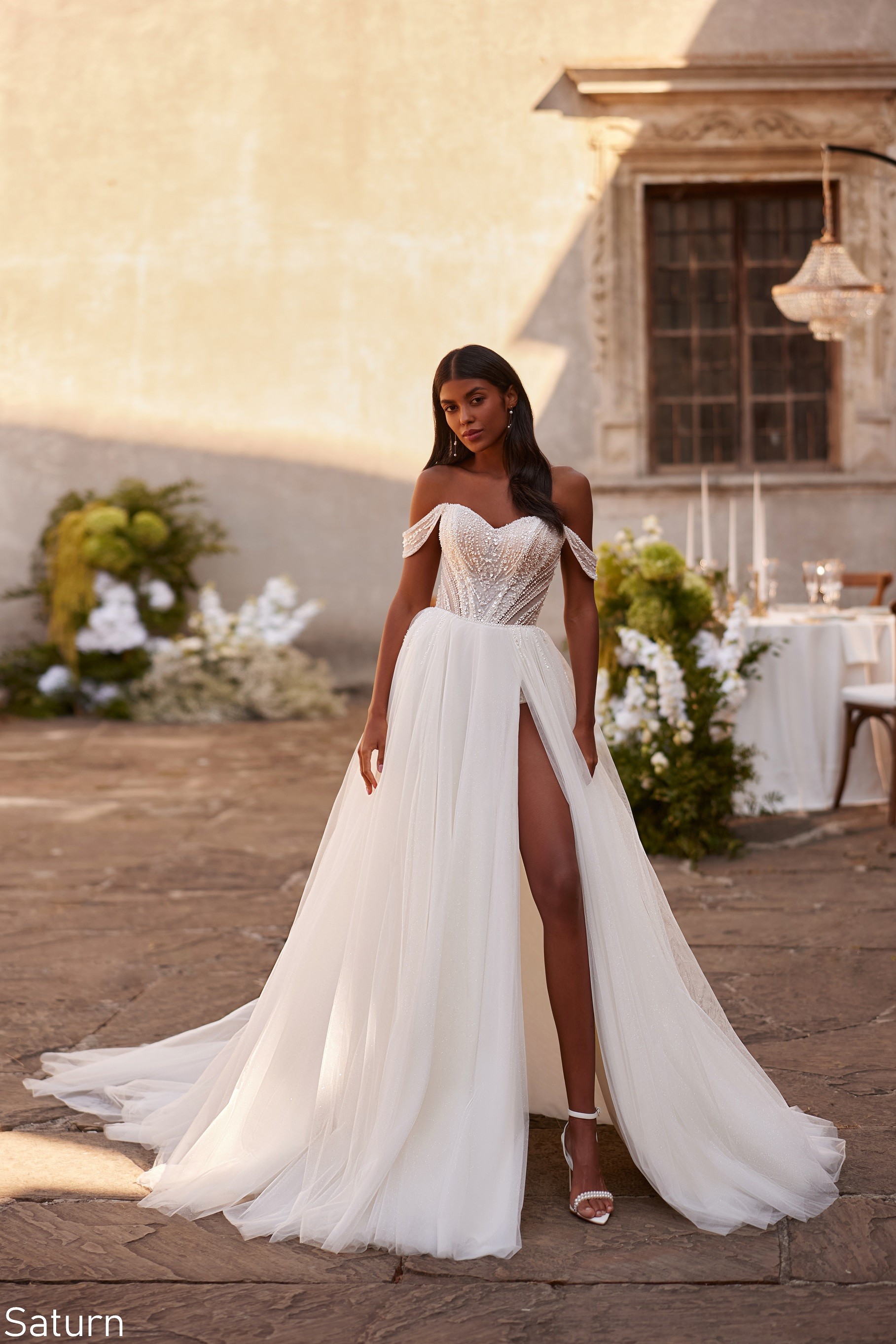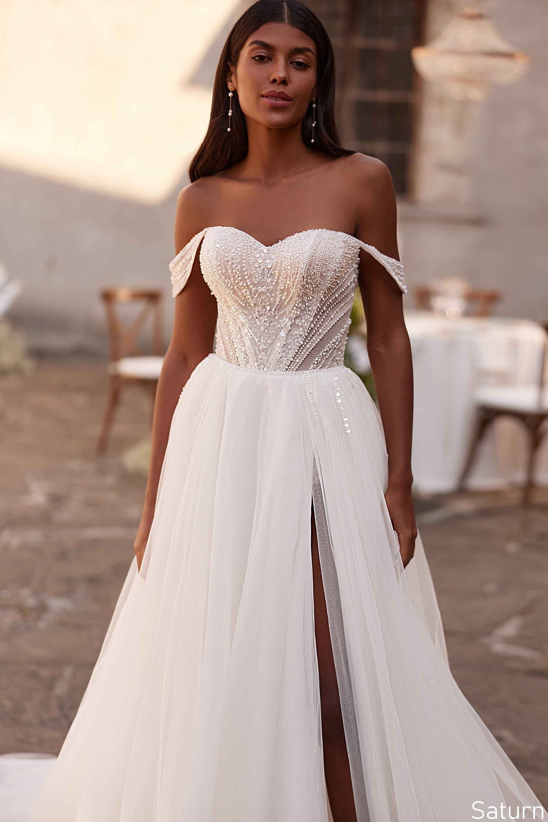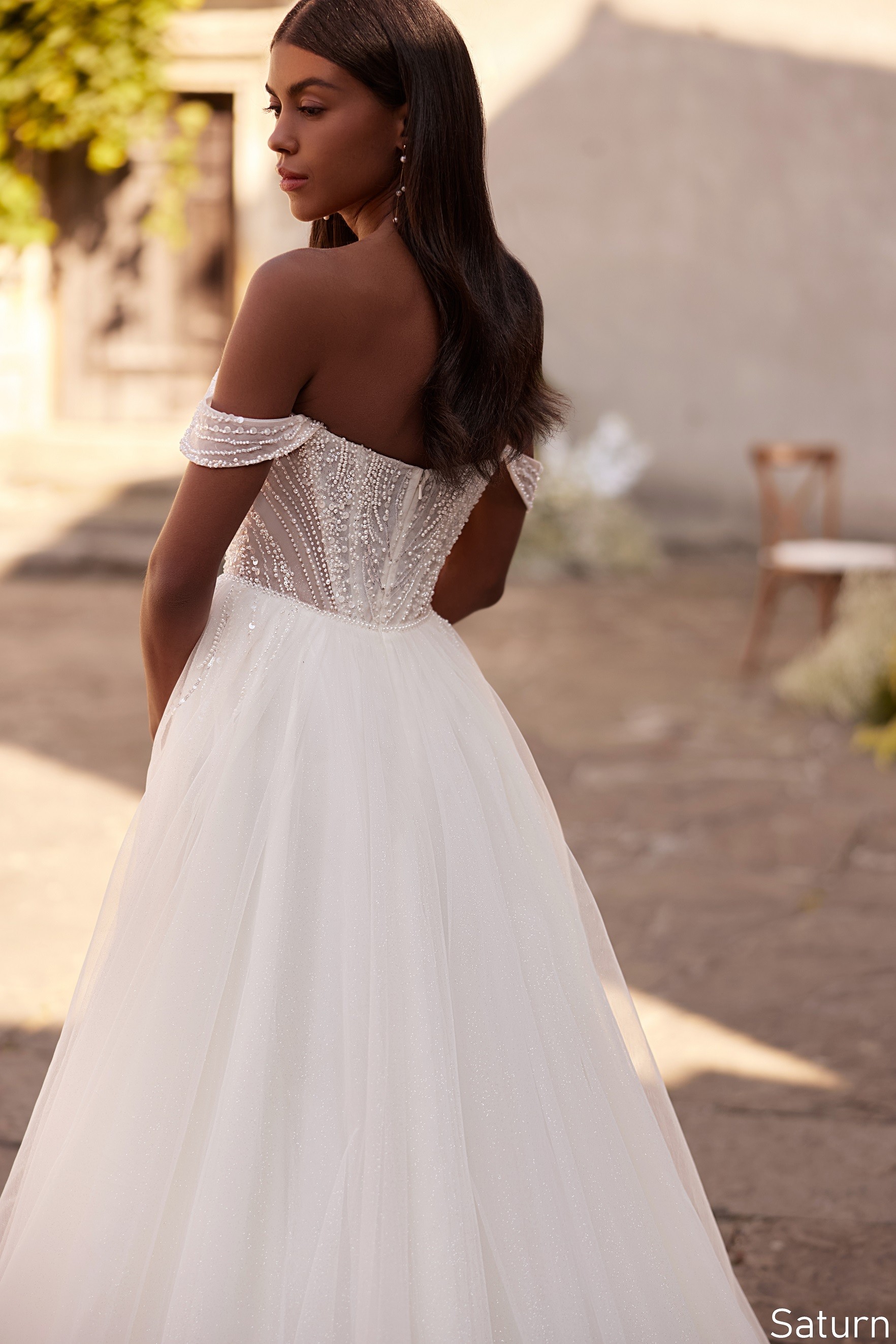Rochia de mireasă Saturn redefinește eleganța modernă printr-un design A-line fluid, realizat din tulle fin cu aplicații strălucitoare. Corsetul sofisticat, decorat manual cu mărgele și paiete, evidențiază silueta, iar bretelele căzute adaugă un aer romantic. Fanta îndrăzneață din fustă completează perfect look-ul, oferind un echilibru între rafinament și senzualitate