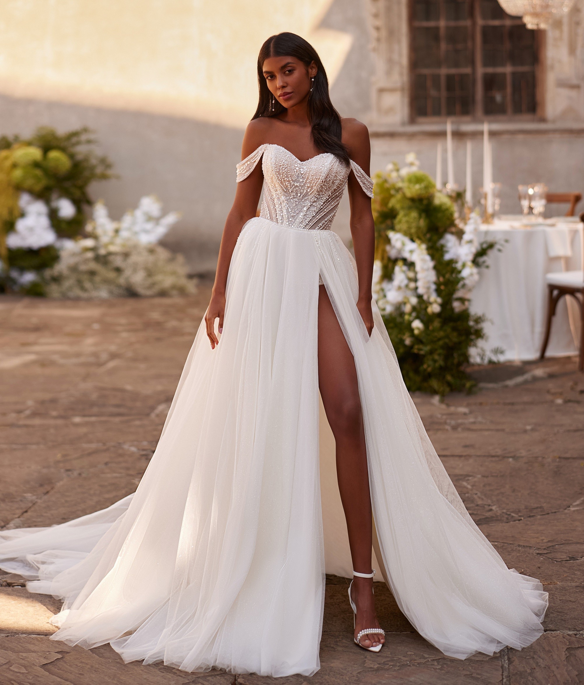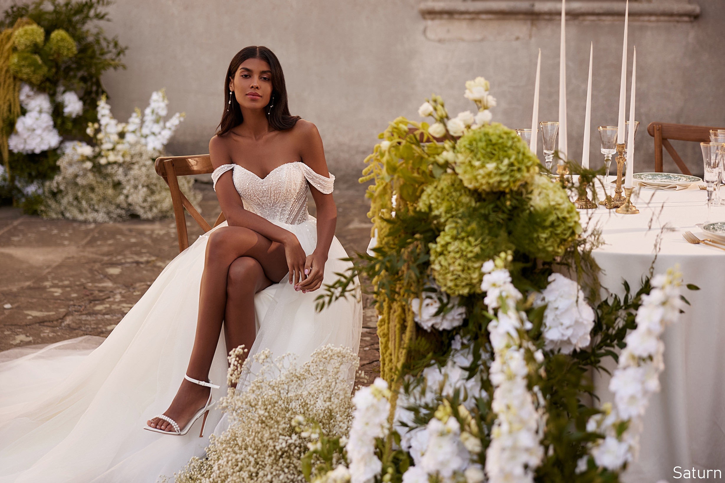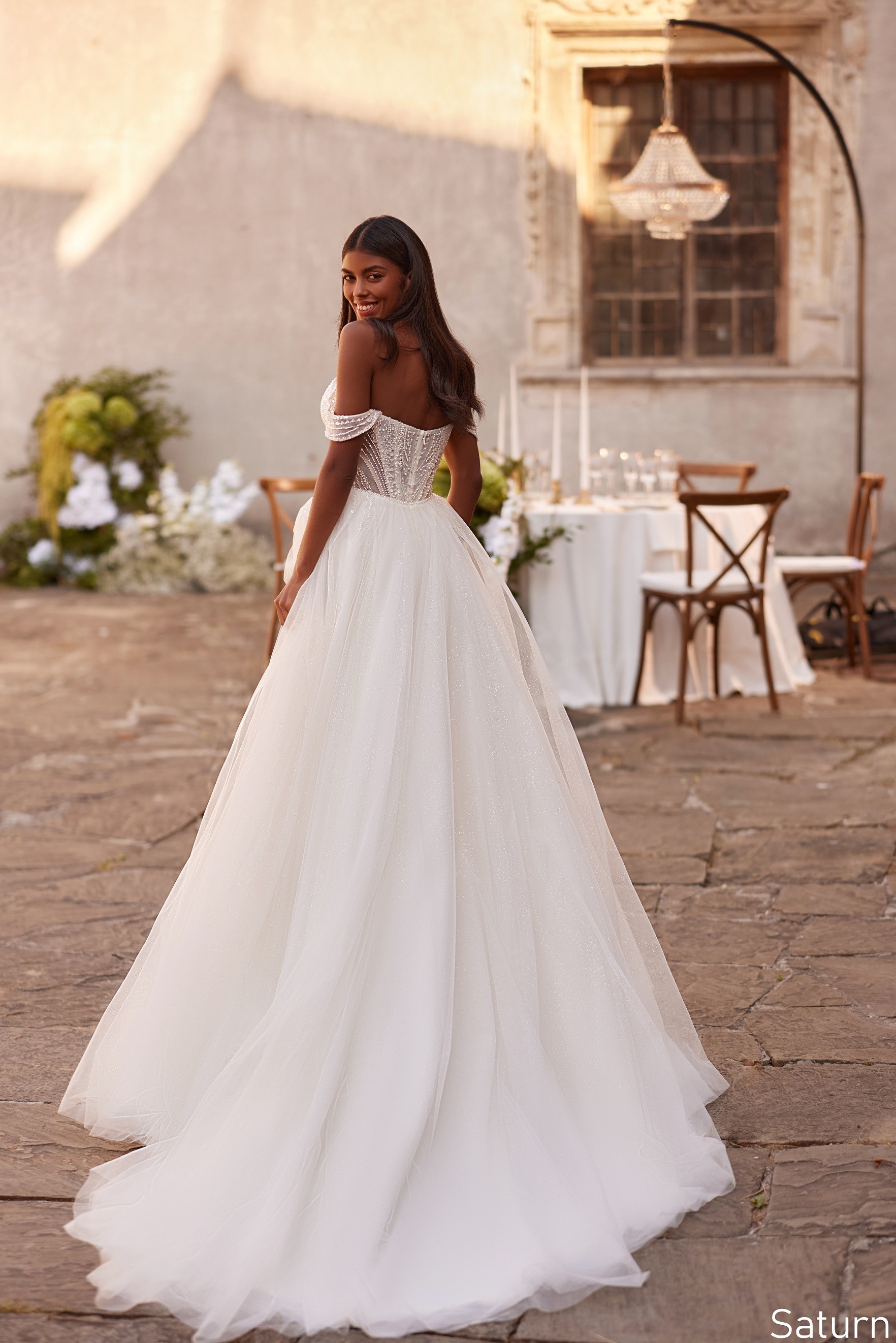 Rochia de mireasă Saturn redefinește eleganța modernă printr-un design A-line fluid, realizat din tulle fin cu aplicații strălucitoare. Corsetul sofisticat, decorat manual cu mărgele și paiete, evidențiază silueta, iar bretelele căzute adaugă un aer romantic. Fanta îndrăzneață din fustă completează perfect look-ul, oferind un echilibru între rafinament și senzualitate
