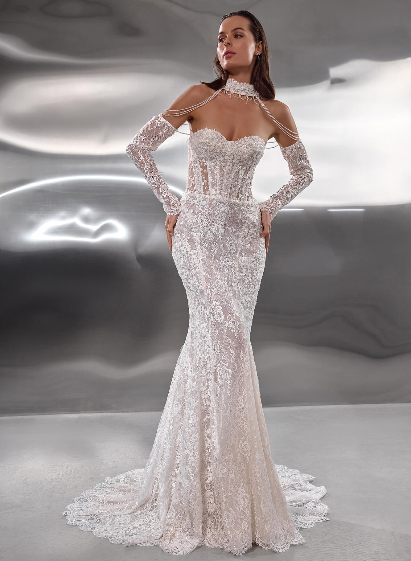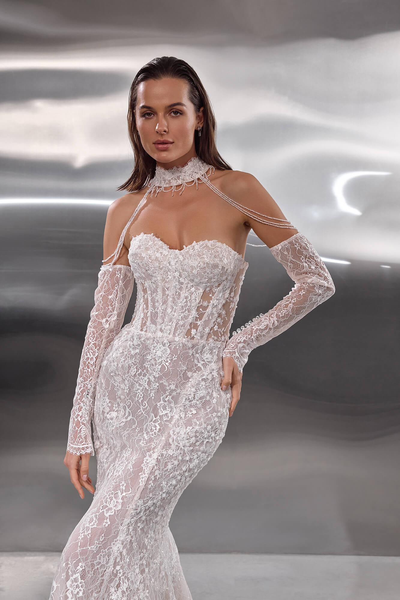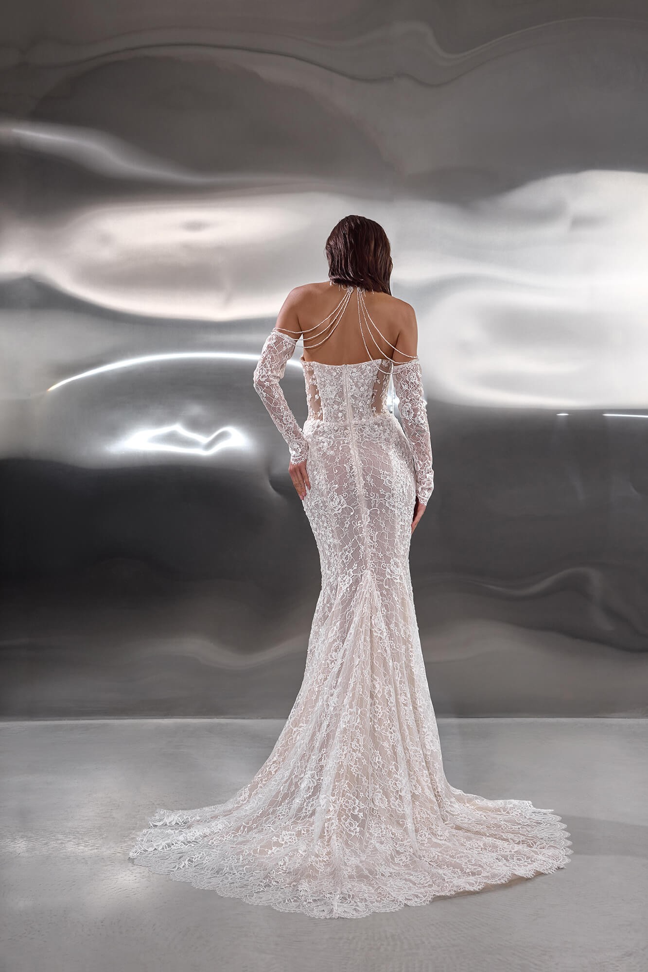 Această rochie de mireasă se remarcă prin eleganța modernă și detaliile couture, fiind concepută pentru mireasa care își dorește o prezență memorabilă. Silueta sirenă pune în valoare liniile feminine, iar dantela fină, lucrată cu atenție, oferă o textură rafinată și un aspect luxos.Bustul este definit printr-un corset structură cu transparențe discrete, ce conferă susținere și un contur armonios. Mâneci lungi din dantelă, detașabile, completează designul, permițând transformarea rochiei în funcție de momentul evenimentului. Detaliile perlate din zona gâtului și bretelele delicate adaugă o notă sofisticată, inspirată din moda bridal de înaltă clasă.Fusta se mulează elegant pe corp, coborând într-o trenă amplă din dantelă, ce oferă fluiditate și impact vizual la fiecare pas.