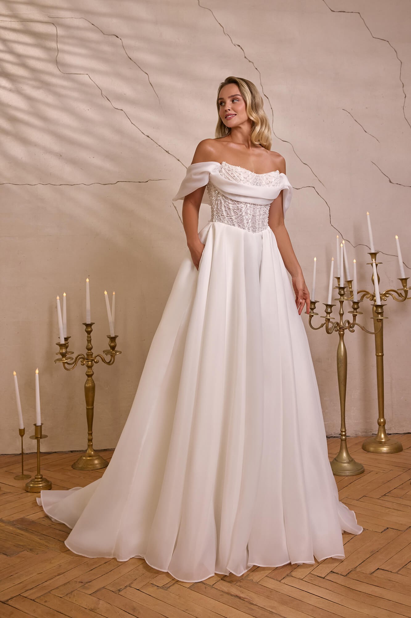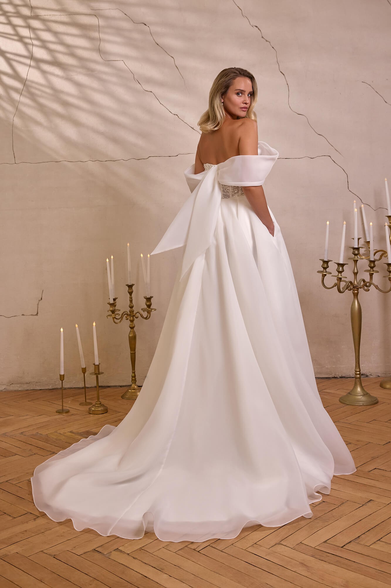 Rochia de mireasă IVONA, realizată în nuanță ivory original, impresionează printr-o fustă amplă în croială A-line, confecționată din organza fină, care creează o senzație de lejeritate, fluiditate și aer diafan la fiecare pas.