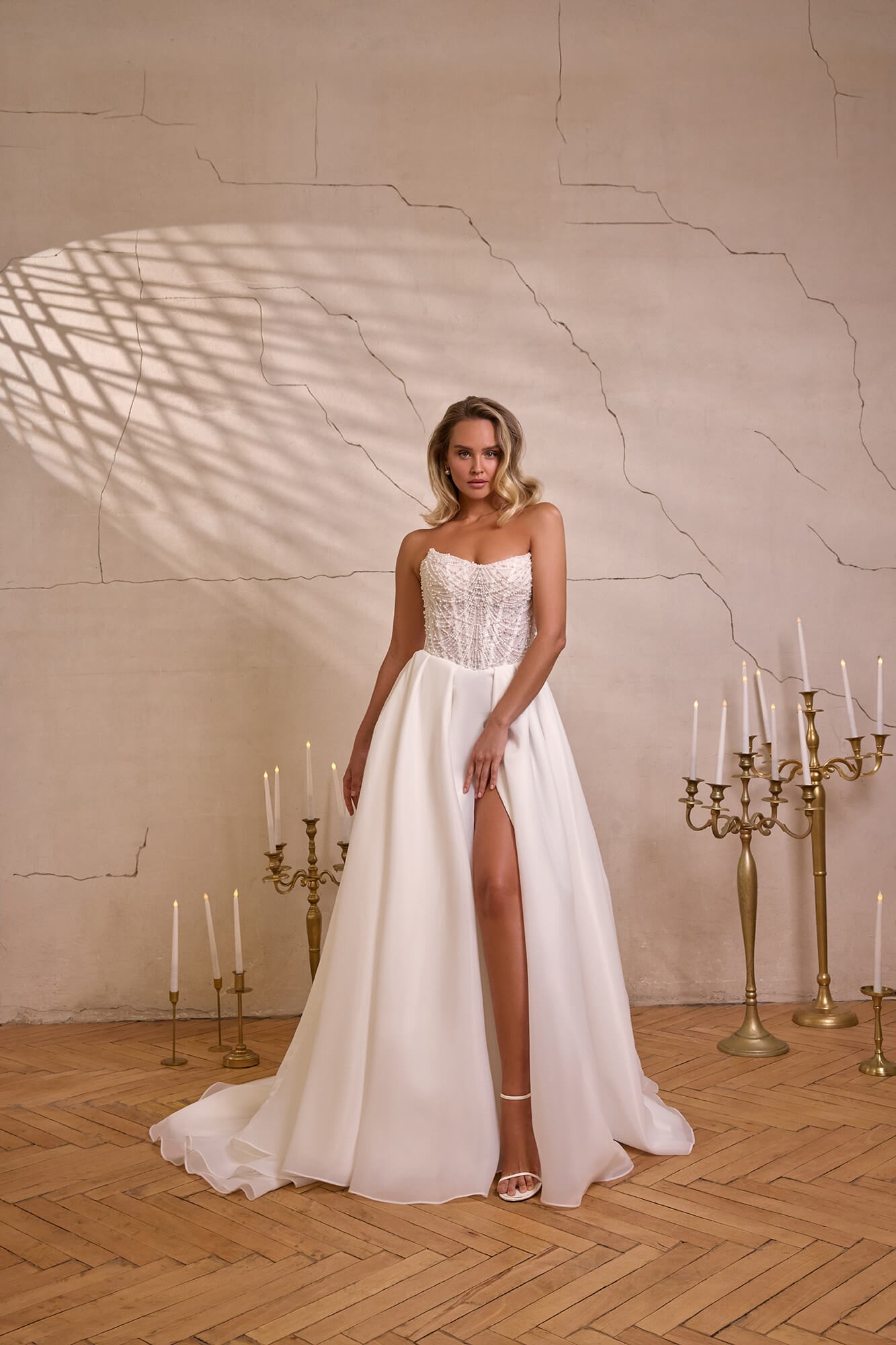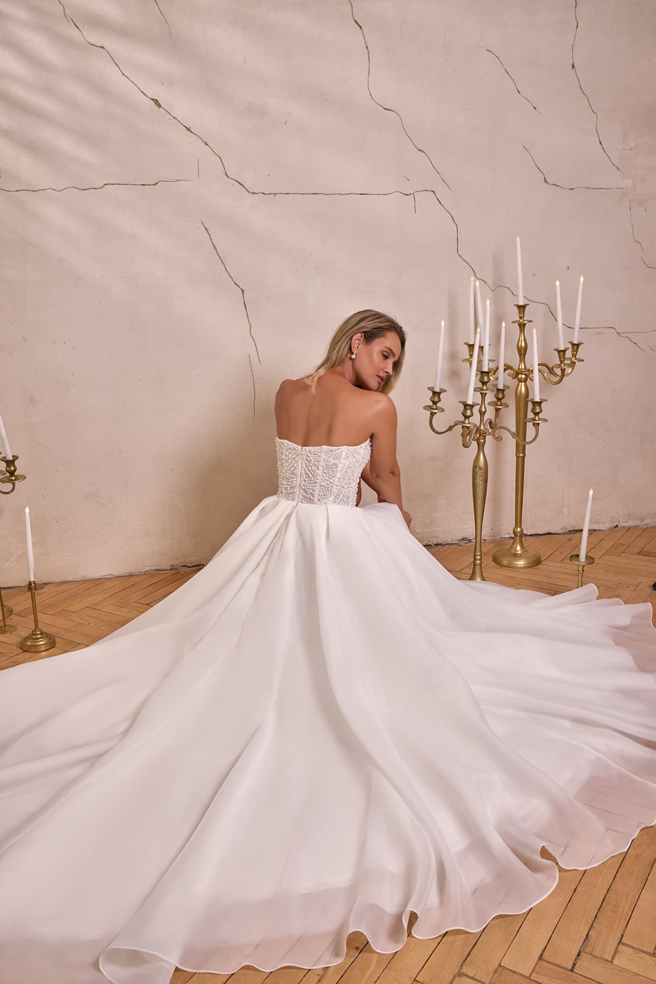Corsetul cu linie a umerilor descoperită este pus în valoare de mâneci căzute drapate, fixate cu pliuri moi, ce oferă un aer romantic și feminin. Bustul este decorat cu broderii rafinate și aplicații delicate cu mărgele, care adaugă strălucire subtilă și un plus de eleganță.