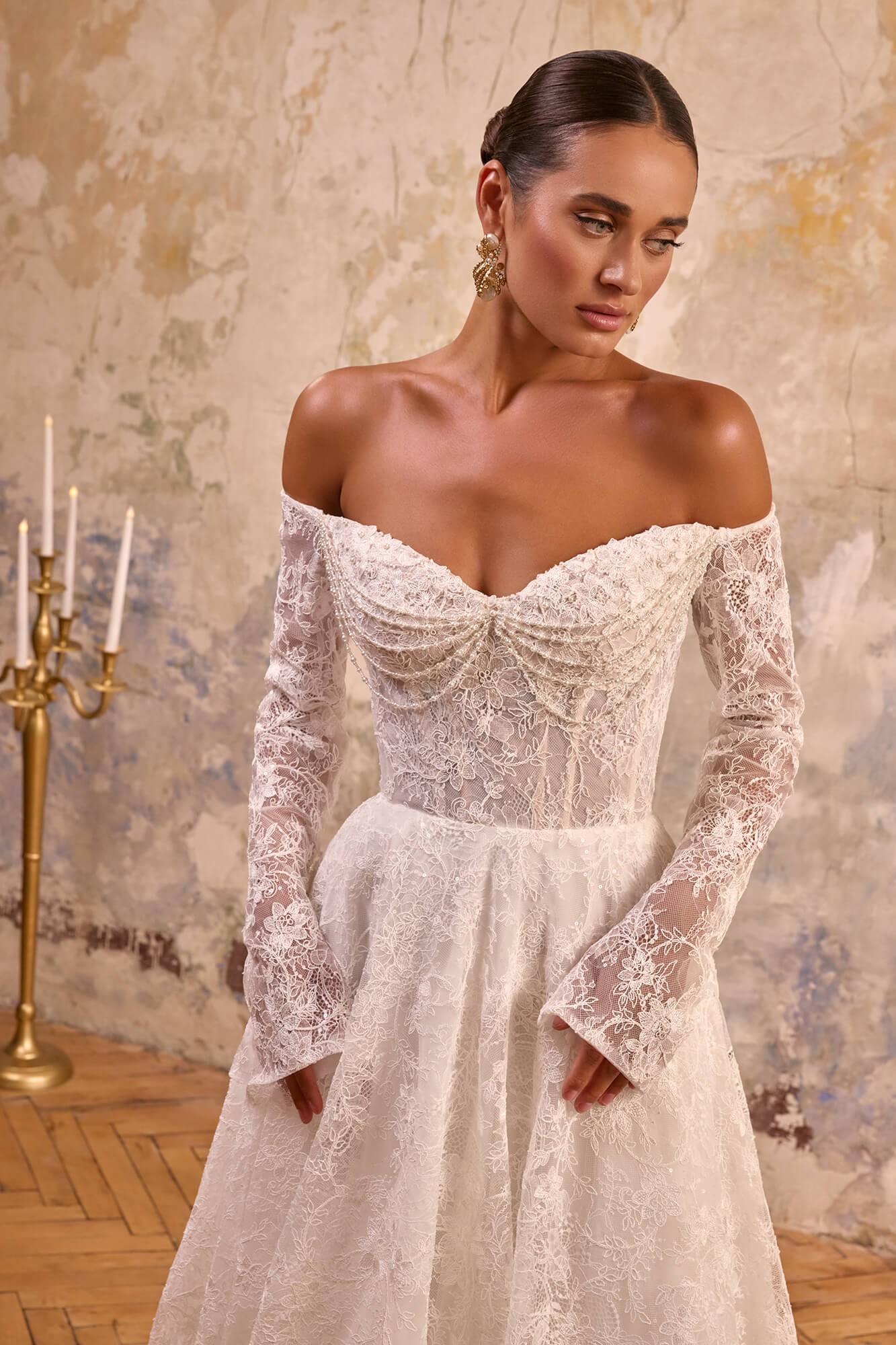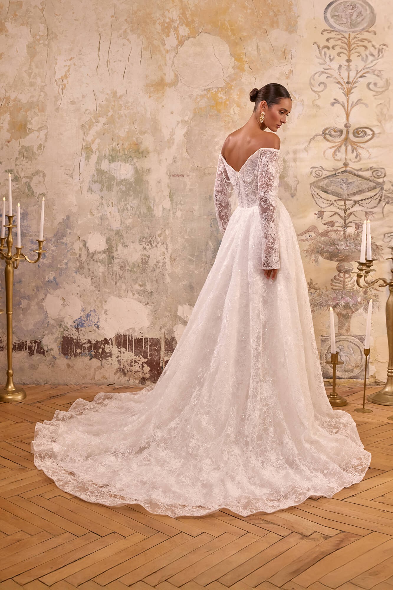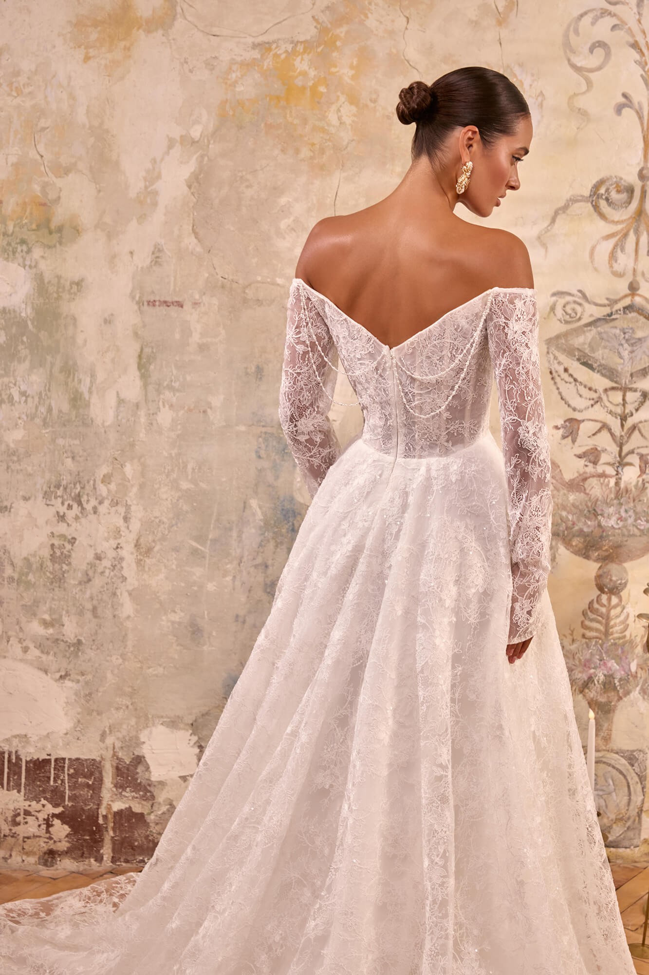 Rochia de mireasă LAVINE, realizată în nuanță ivory spectaculos, este confecționată din dantelă rafinată, bogat decorată cu motive florale și broderii fine din paiete, care oferă un efect subtil de strălucire la fiecare mișcare.