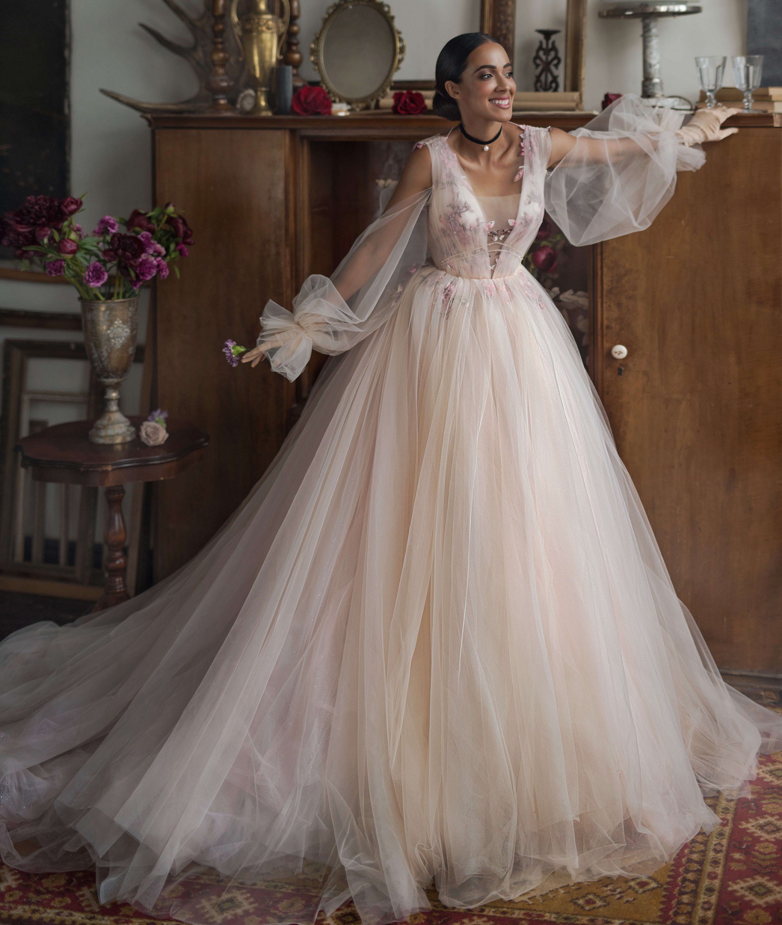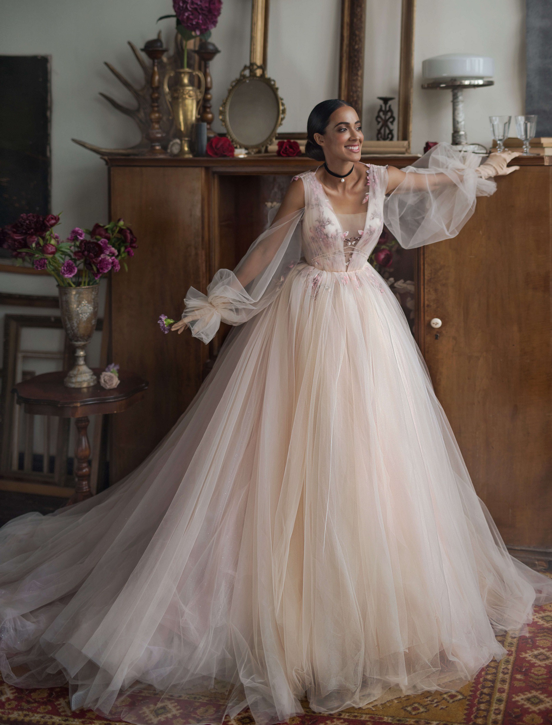 Rochie de mireasa printesa, realizata din tull fin, cu insertii de dantela si margele. Apollo este o rochie de mireasa inedita, romantica si exclusivista care te uimeste prin croiala ingenioasa. O rochie speciala
